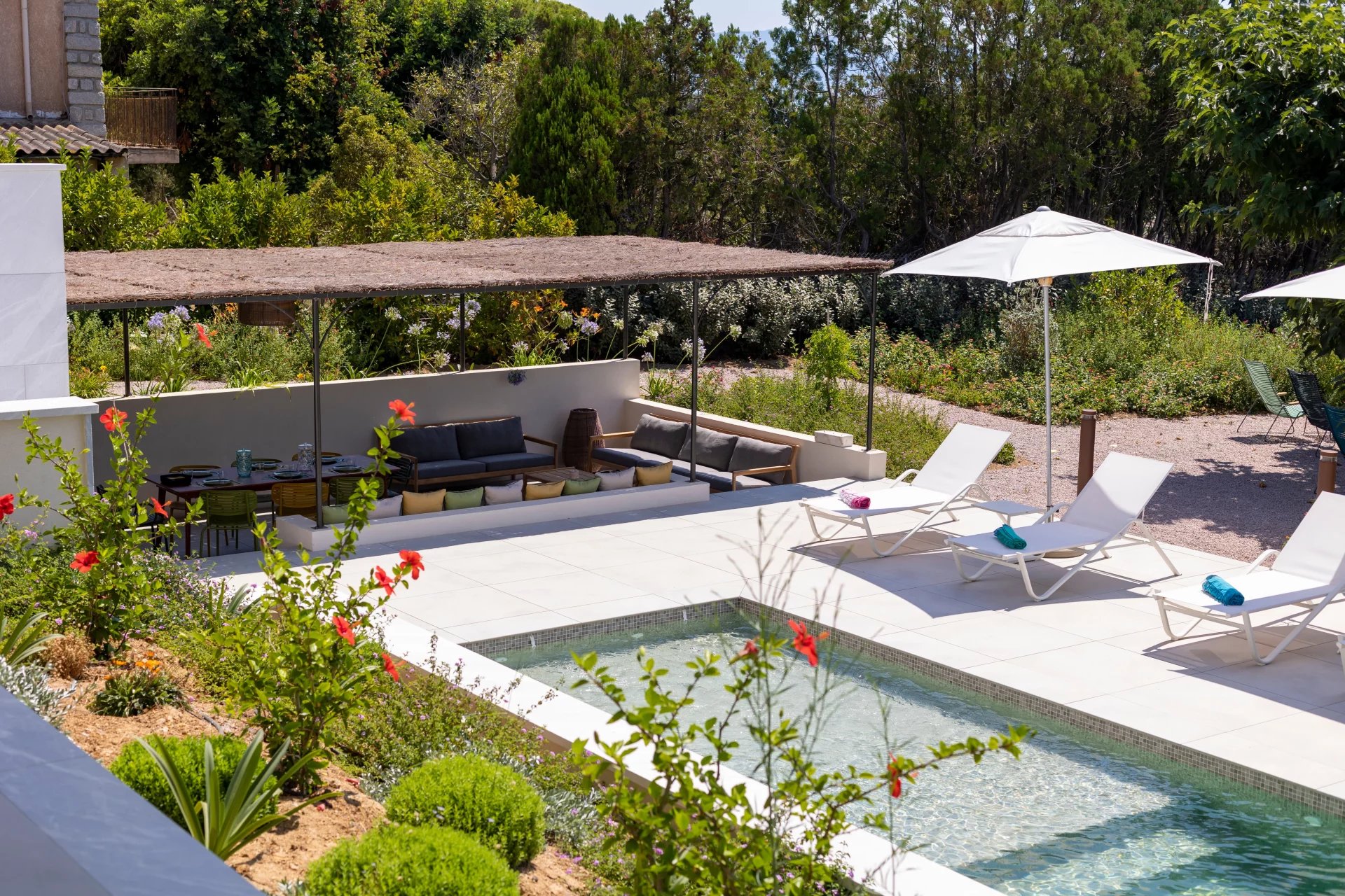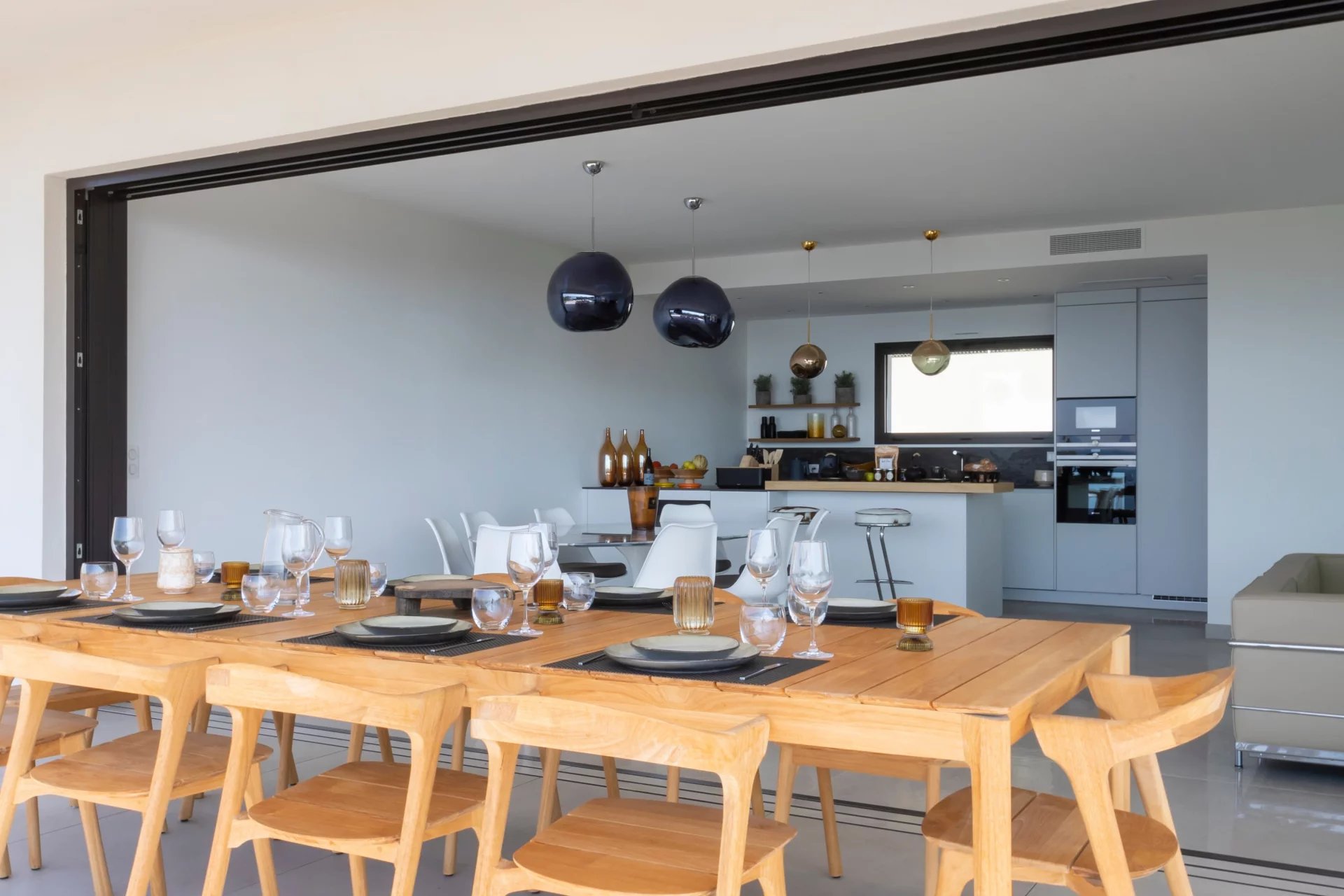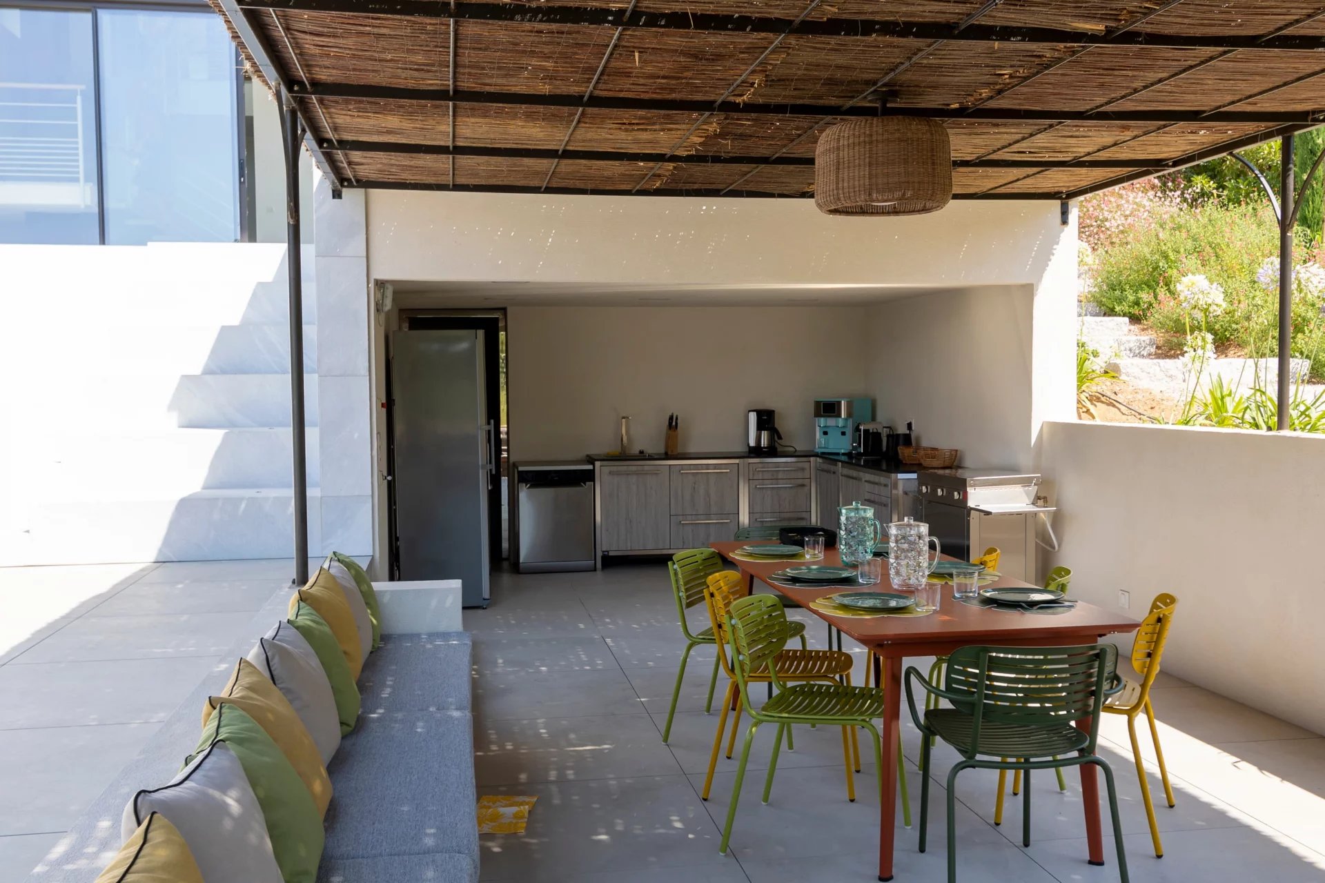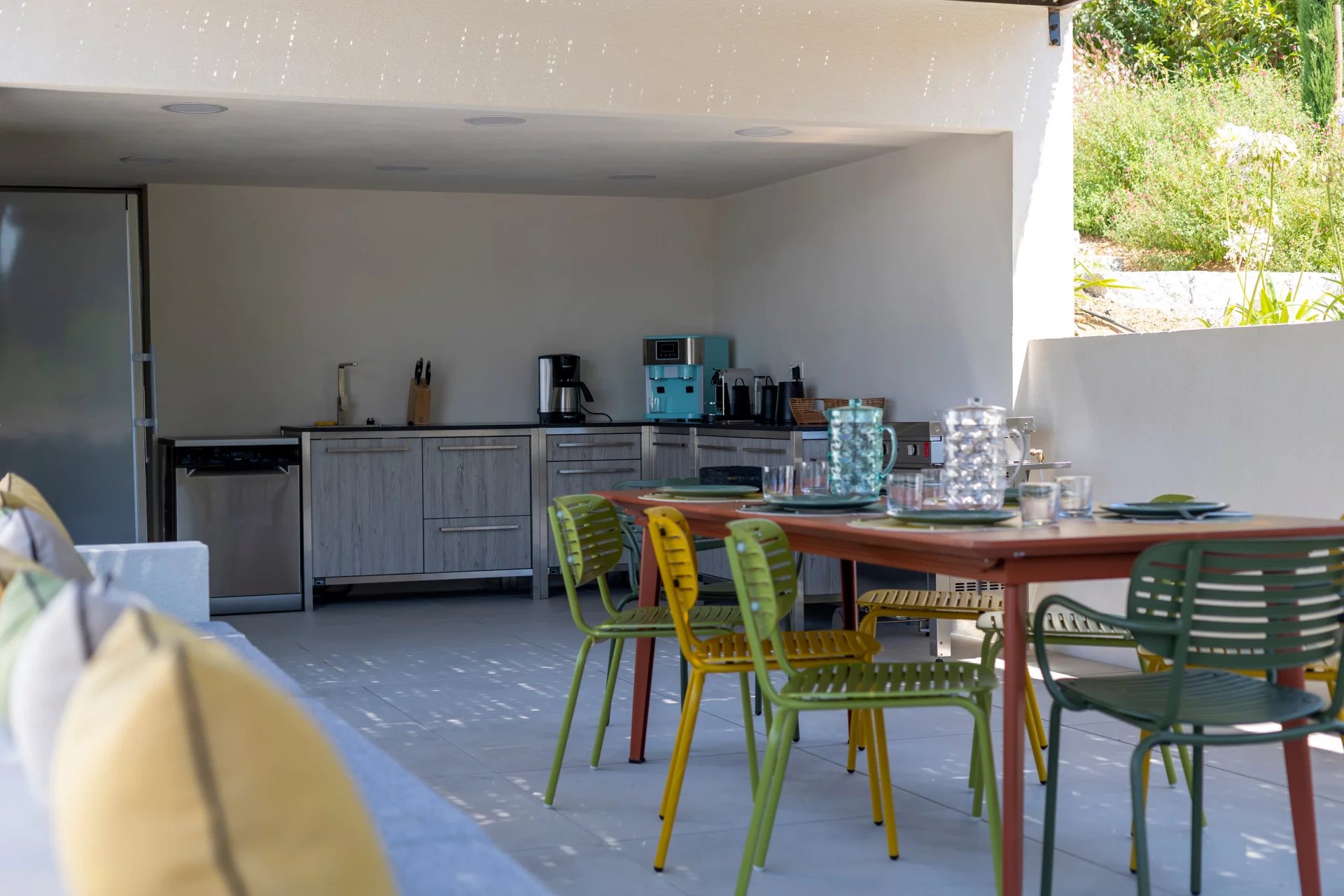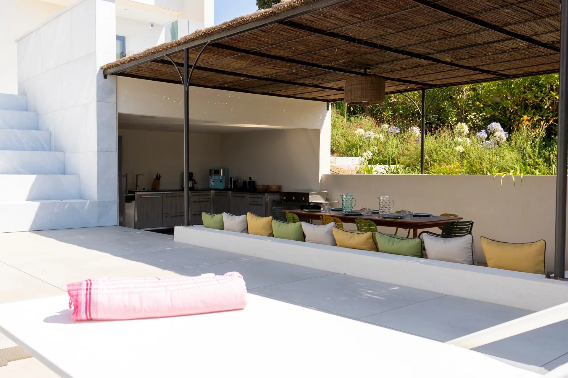 Les extérieurs sont magnifiquement aménagés avec une piscine chauffée de 12 x 5 m, dotée d'une plage immergée. Un espace repas ombragé avec une cuisine extérieure entièrement équipée peut accueillir jusqu'à 10 personnes pour des repas conviviaux en plein air.
