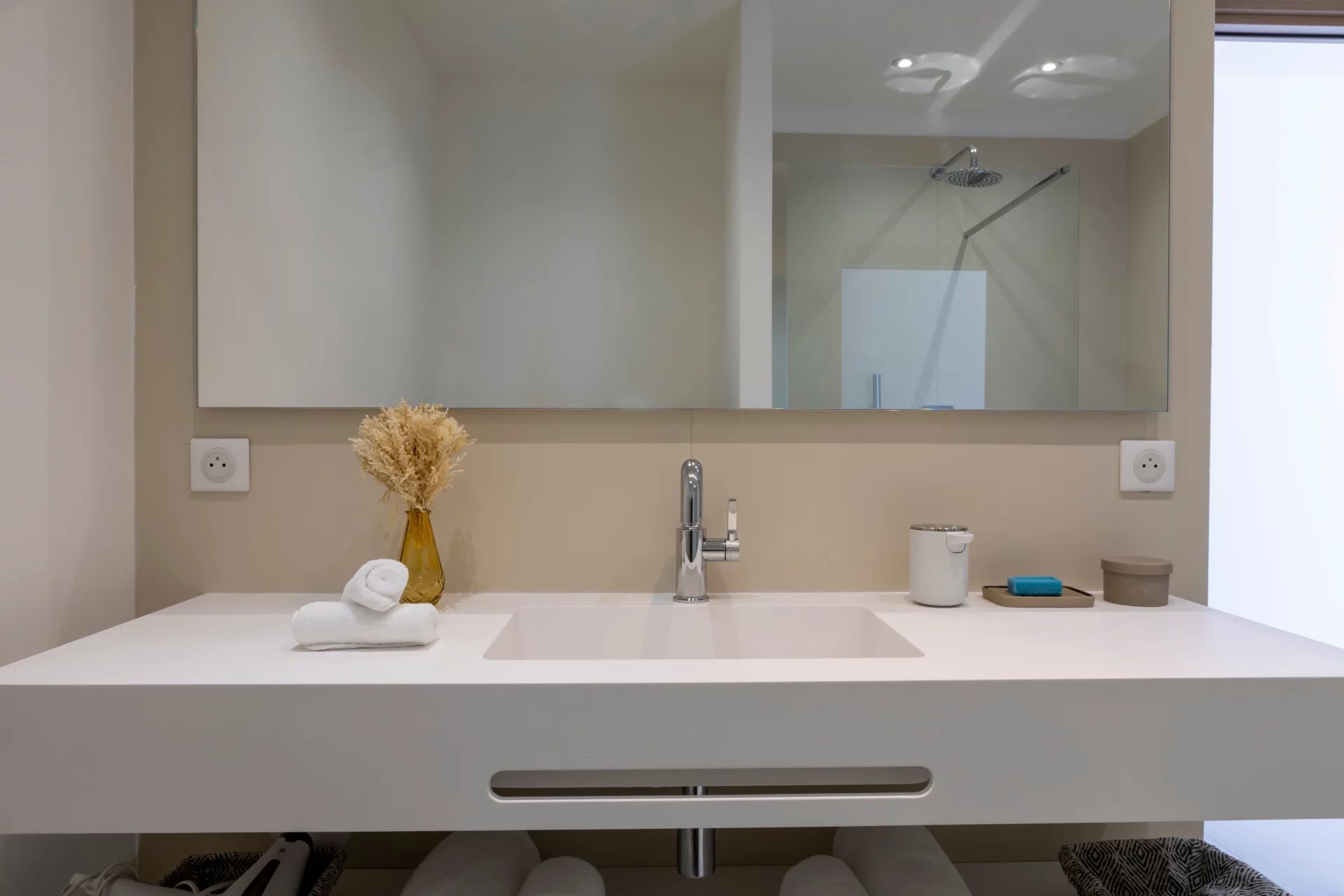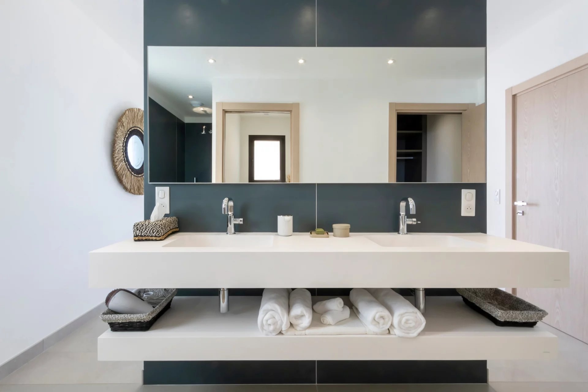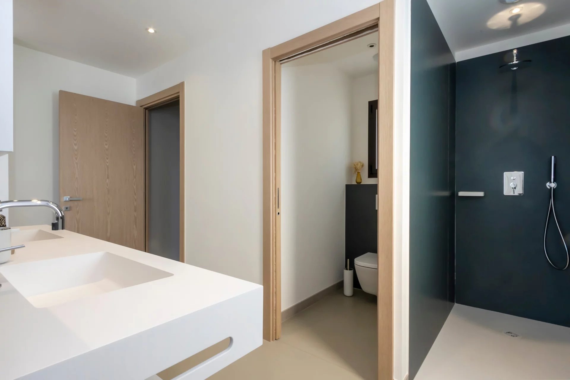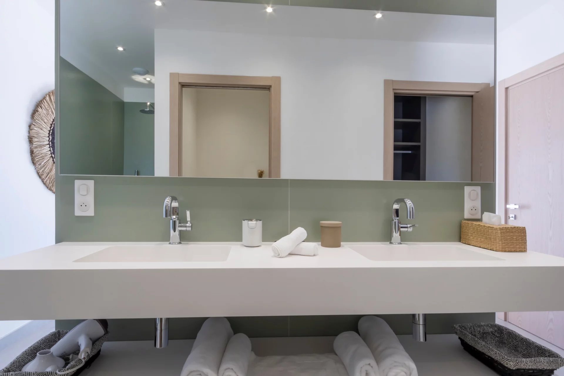 La villa se compose de 4 chambres en suite, chacune avec salle d'eau et commodités privatives pour un confort optimal. Au premier étage, vous trouverez une grande pièce à vivre lumineuse avec un espace repas, une cuisine ouverte entièrement équipée et un salon TV. Une chambre est également située à cet étage. Un majestueux escalier en marbre de Carrare vous conduit au rez-de-chaussée où se trouvent trois autres chambres avec vue sur le jardin et la mer.