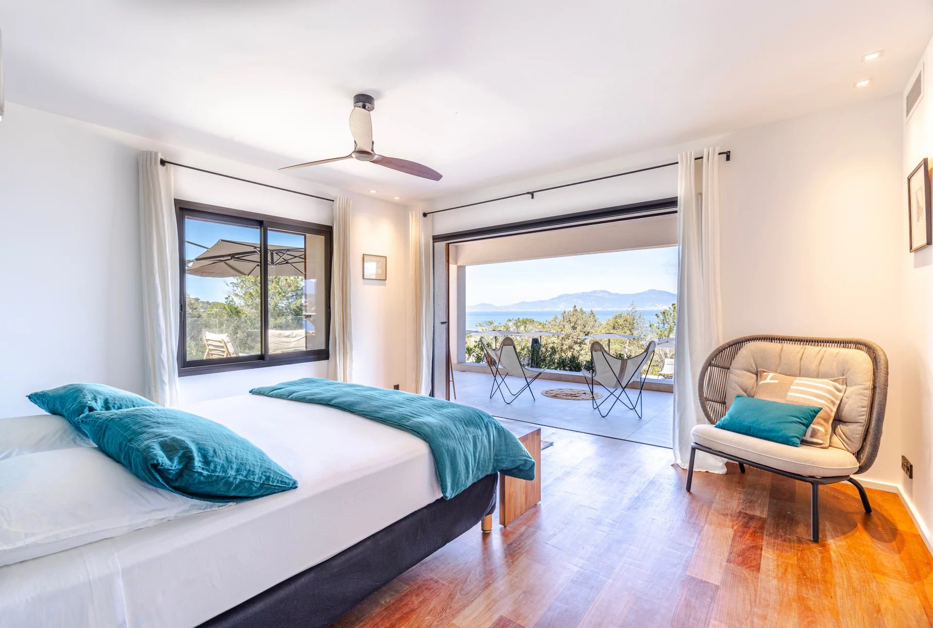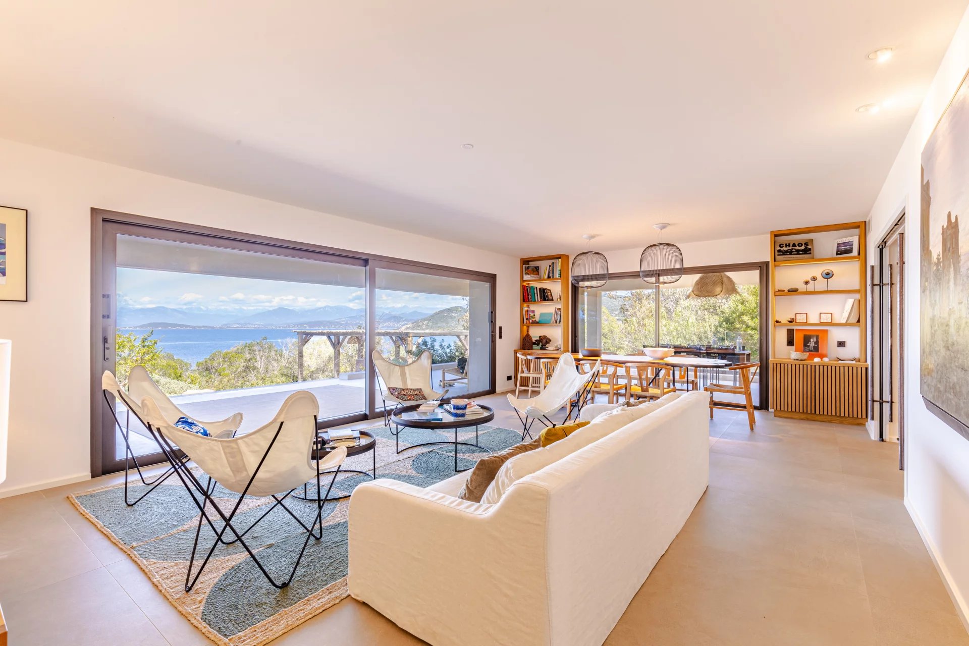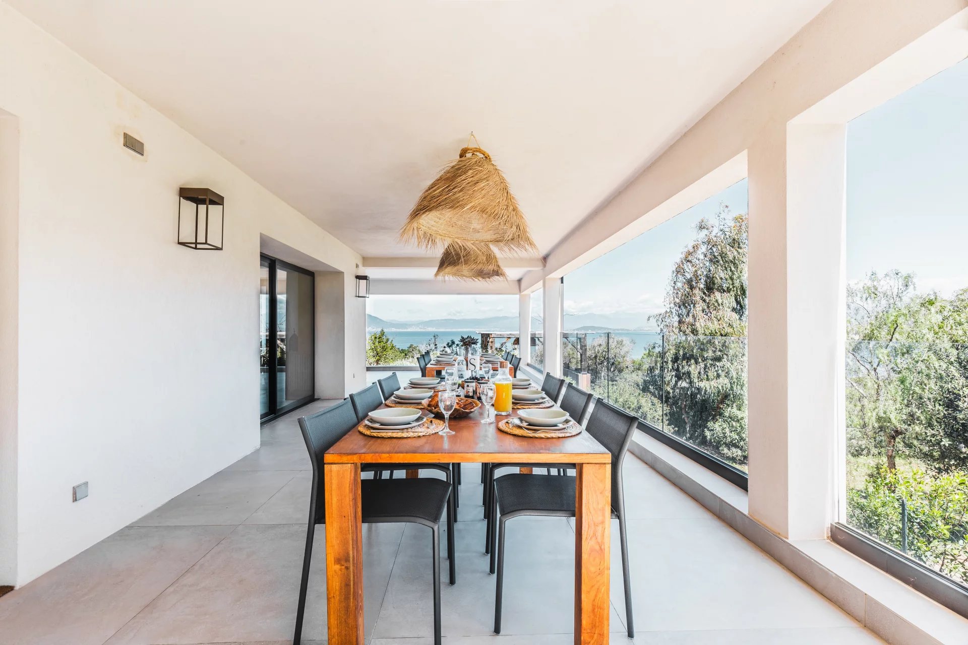 Cette villa d'exception, décorée avec élégance, est située dans un cadre naturel unique avec un accès direct à une crique privée et une vue imprenable sur le Golfe d'Ajaccio. Son salon lumineux avec cuisine ouverte mène à une vaste terrasse couverte, idéale pour des moments de détente.