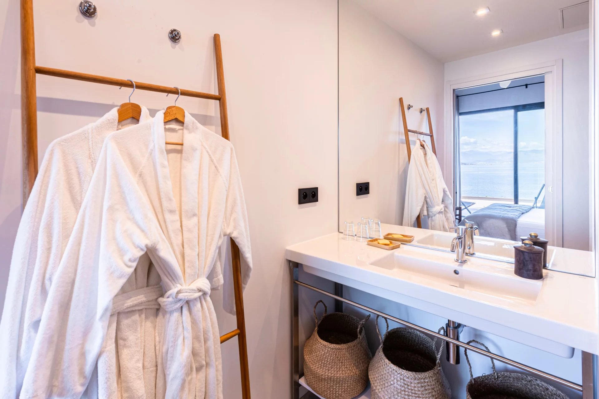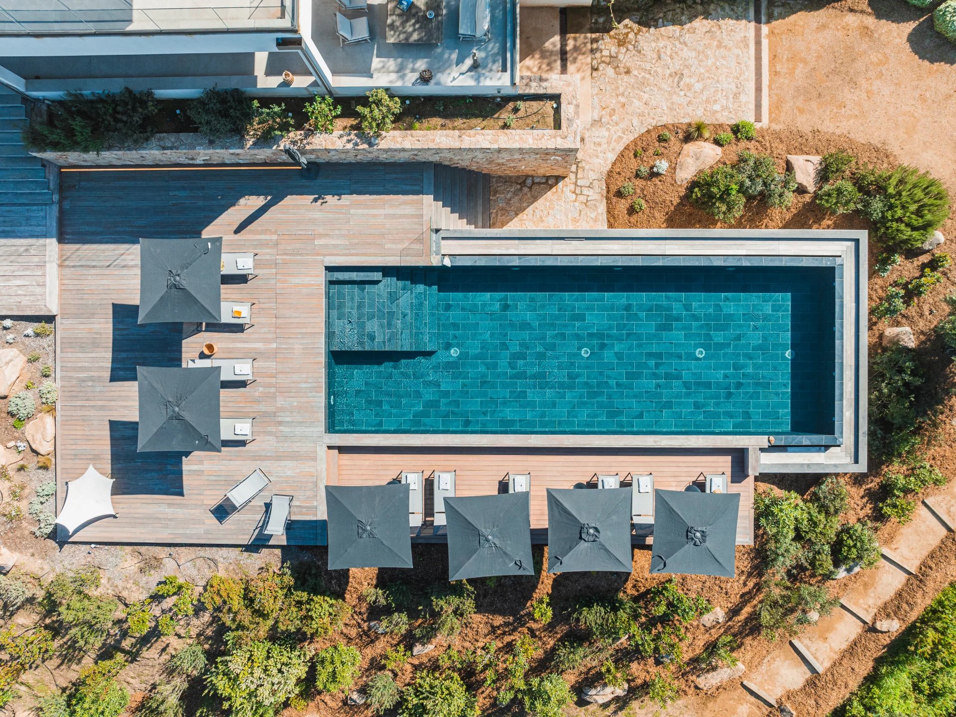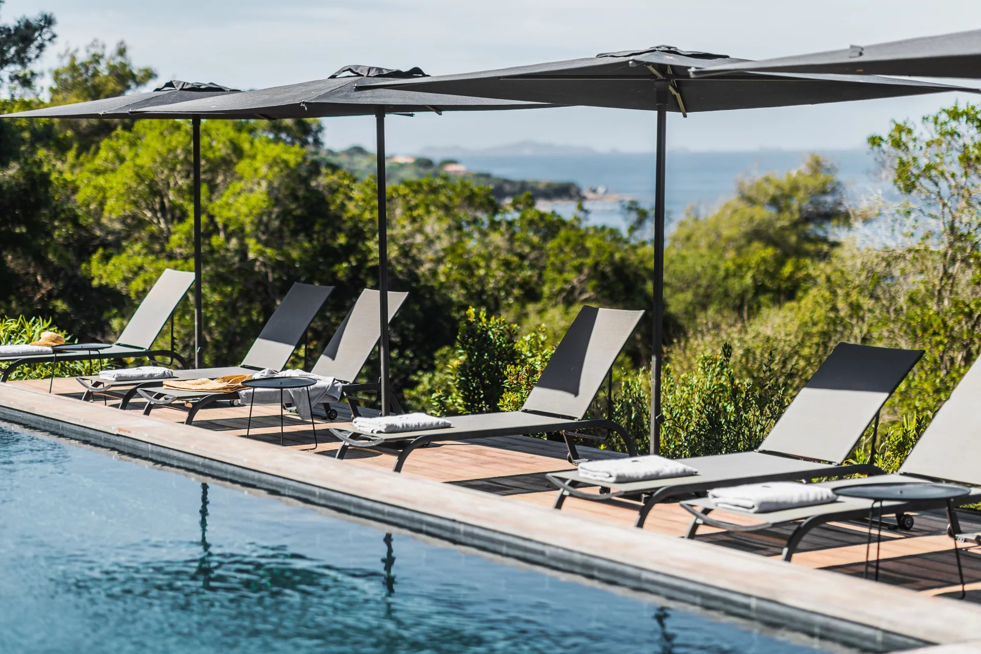 À l'étage inférieur, une piscine de 15 x 5 mètres s'accompagne d'un espace détente spacieux. Le terrain de plus de 4 hectares, en bord de mer, offre diverses installations de loisirs, comme un terrain de pétanque et un Pitch and Putt professionnel de 500 m², ainsi qu'un accès exclusif à une crique de sable et rochers.