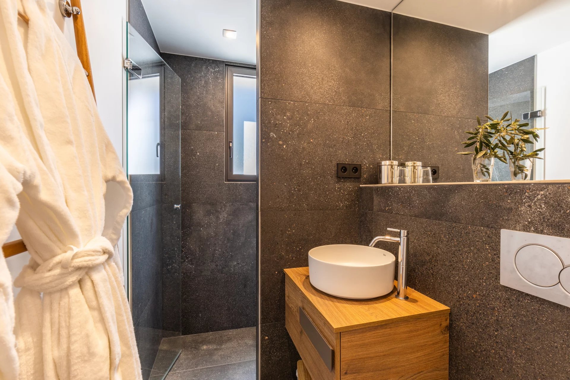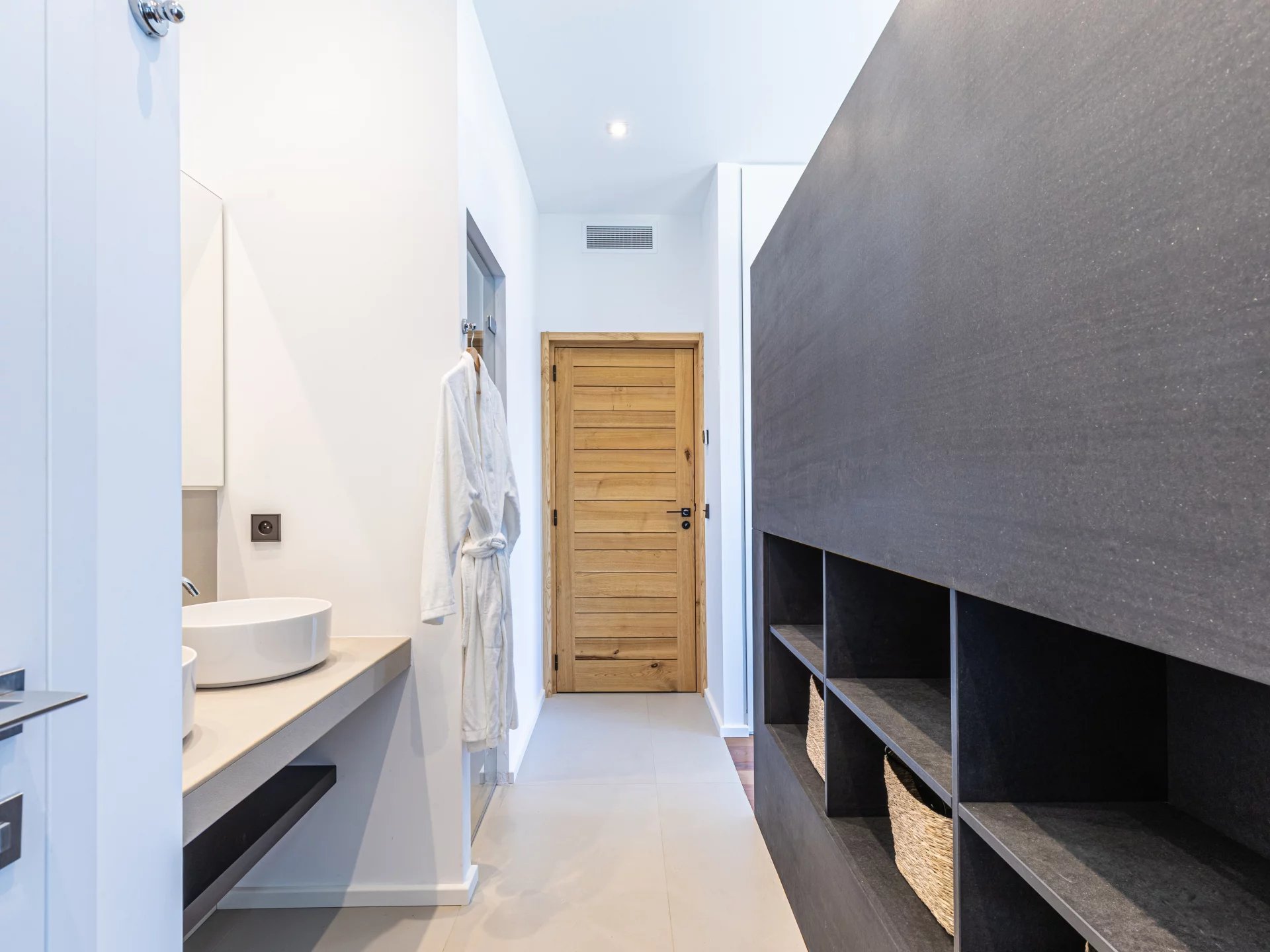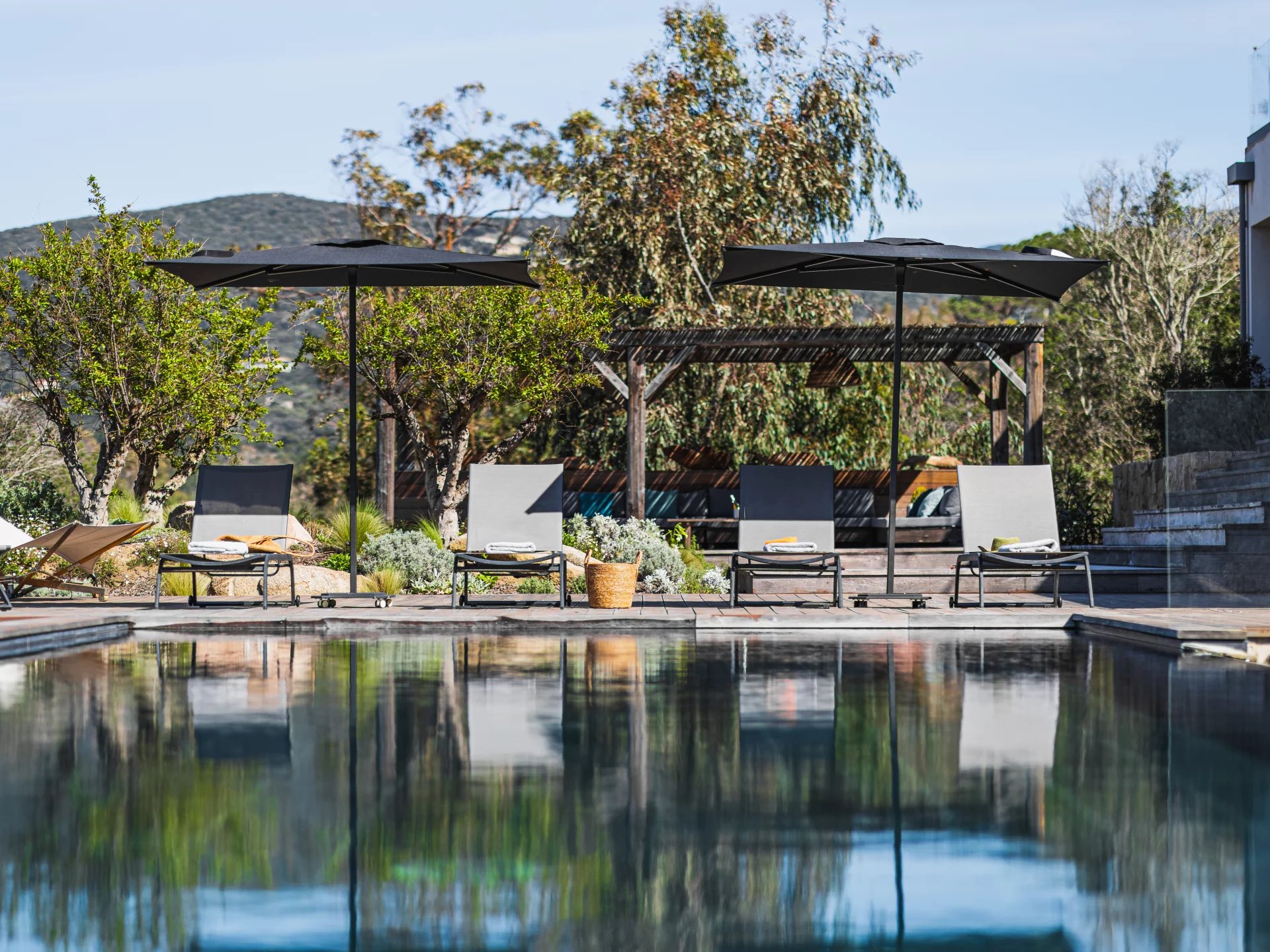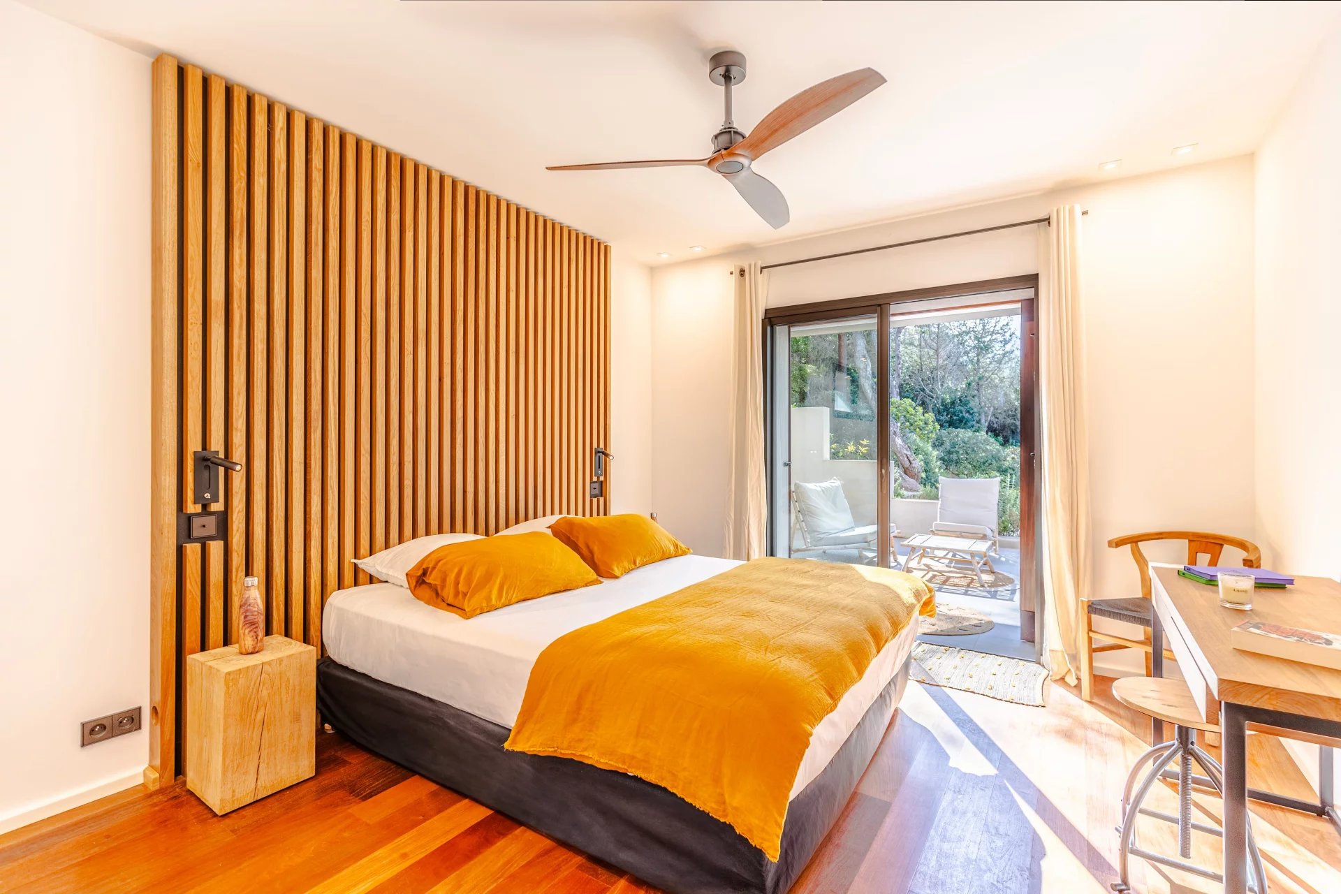 À l'étage inférieur, une piscine de 15 x 5 mètres s'accompagne d'un espace détente spacieux. Le terrain de plus de 4 hectares, en bord de mer, offre diverses installations de loisirs, comme un terrain de pétanque et un Pitch and Putt professionnel de 500 m², ainsi qu'un accès exclusif à une crique de sable et rochers.