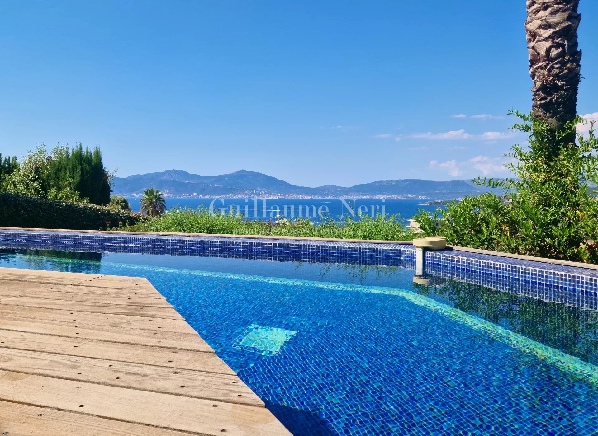 À l’extérieur, profitez d’un cadre de vie exceptionnel : vaste terrasse avec jacuzzi, coin barbecue, piscine, jardin paysagé... et une vue panoramique sur le Golfe d’Ajaccio.