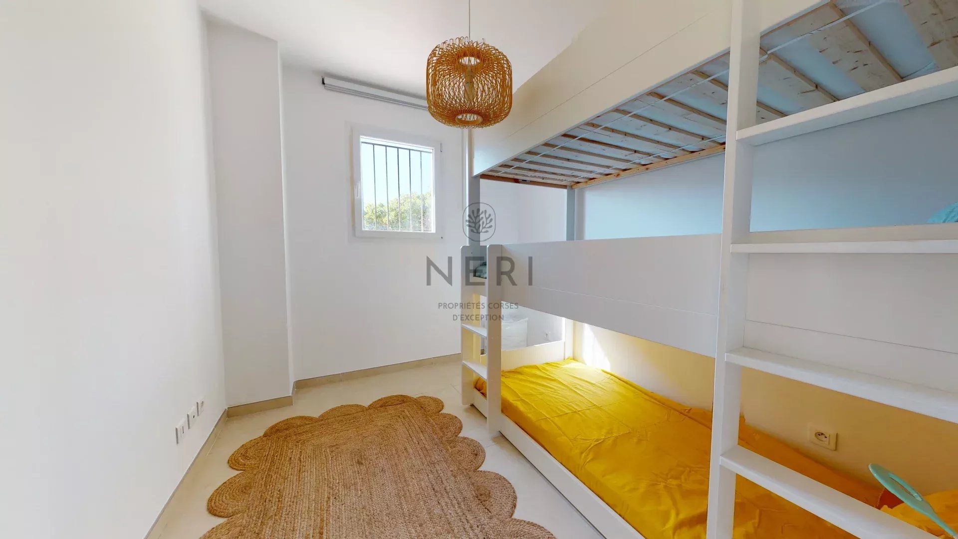 Au rez-de-chaussée, vous trouverez une chambre parentale avec sa salle d'eau privative, qui donne un accès direct à la terrasse de la piscine. À l'étage, la villa dispose de 4 chambres avec grands lits (1 chambre avec un lit de 160 cm et 2 chambres avec des lits de 140 cm), ainsi qu'une chambre supplémentaire avec 3 lits superposés.