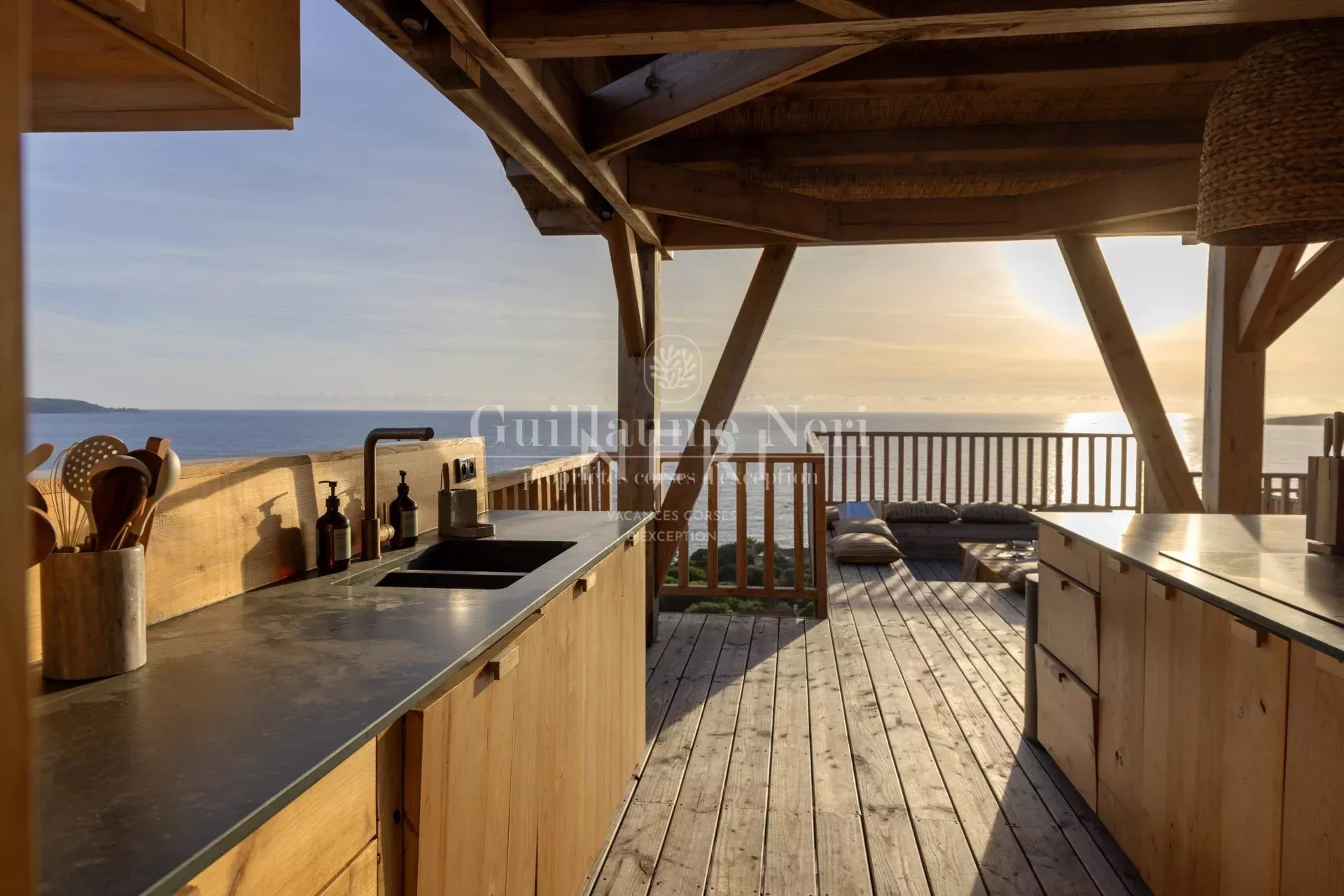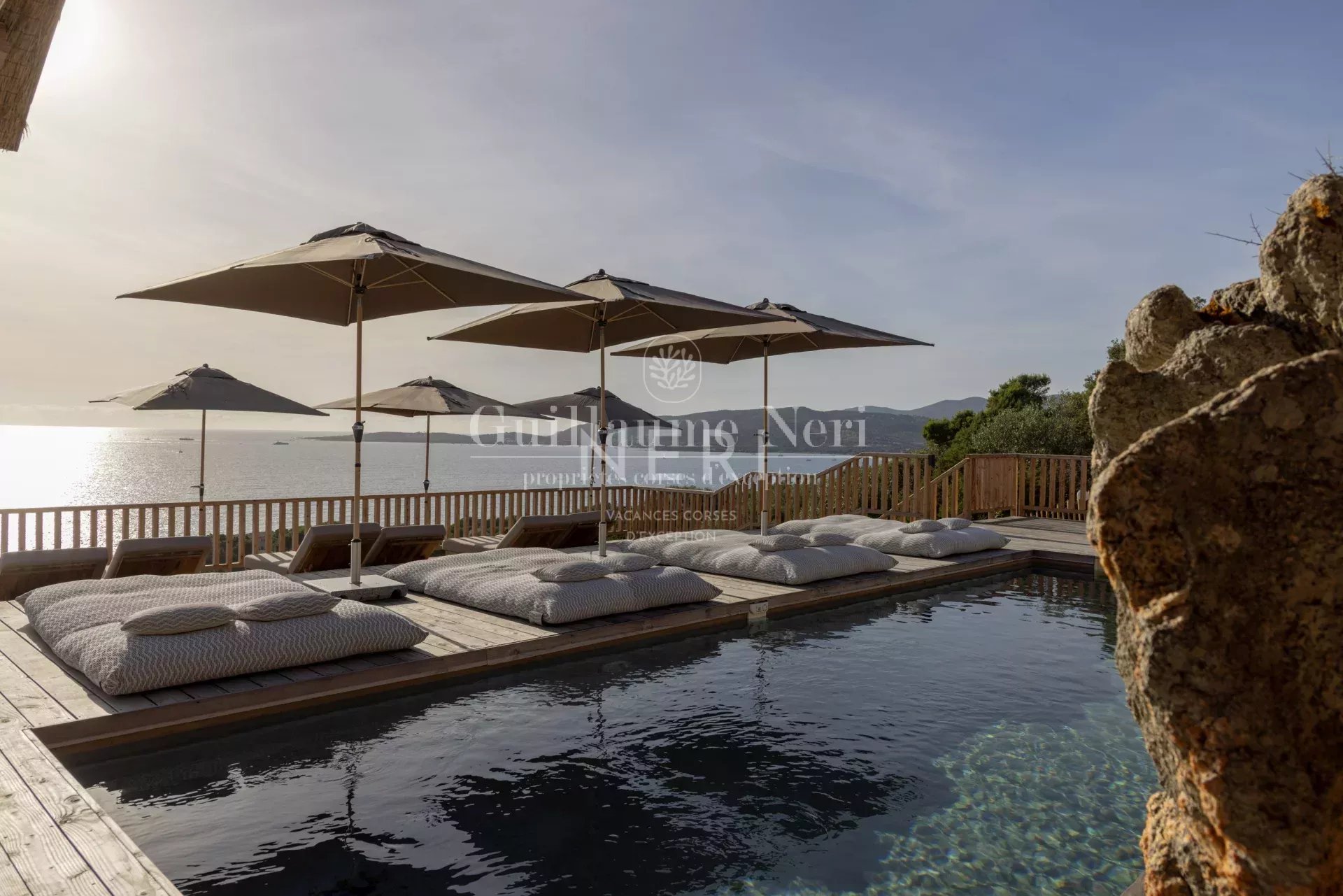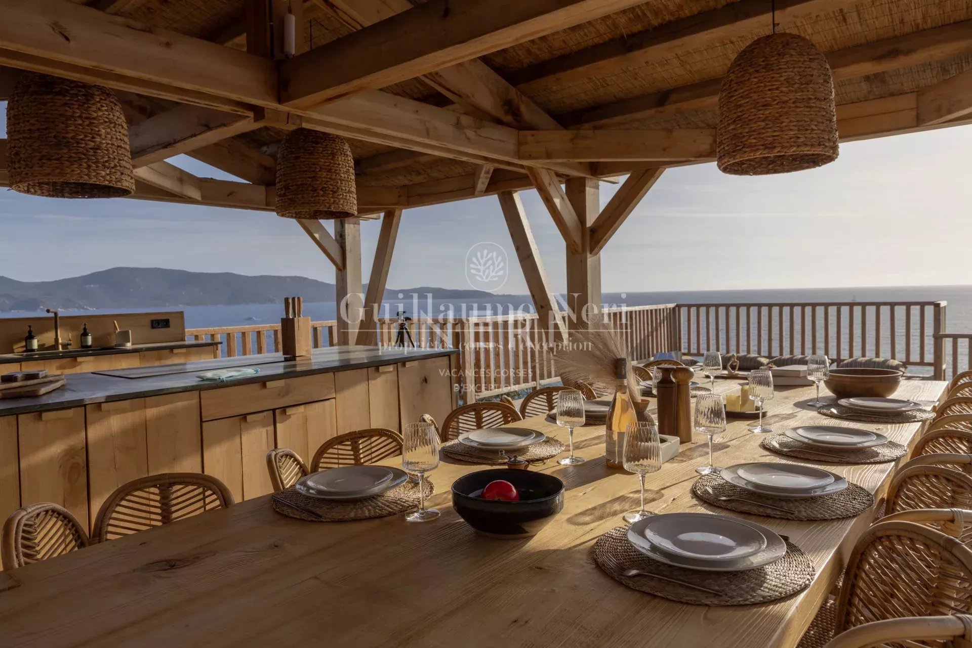 L’extérieur séduit par sa piscine unique de 9m x 3,30m, intégrée autour d’un rocher naturel. Des doubles beds de piscine vous accueillent confortable face à la mer. Le pool house couvert propose un espace détente avec banquettes, une grande table pour 20 convives et une cuisine extérieure toute équipée avec barbecue. Détente et convivialité assurée dans cette propriété d'exception.