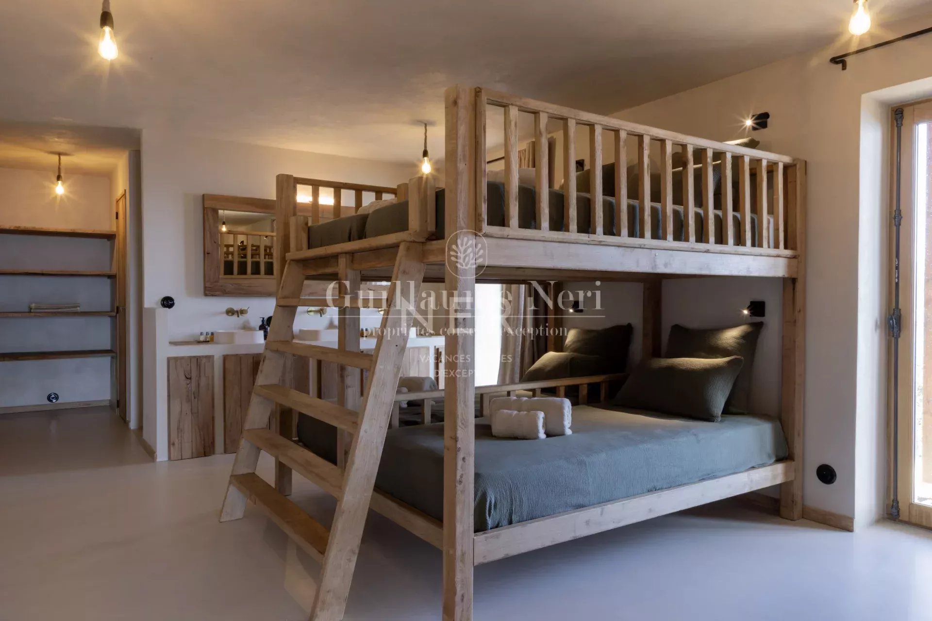 Avec ses 250m² sur deux étages, elle dispose de trois chambres doubles en suite, ainsi qu’un dortoir. Deux chambres supplémentaires en suite sont situées sous la piscine, garantissant intimité et confort.