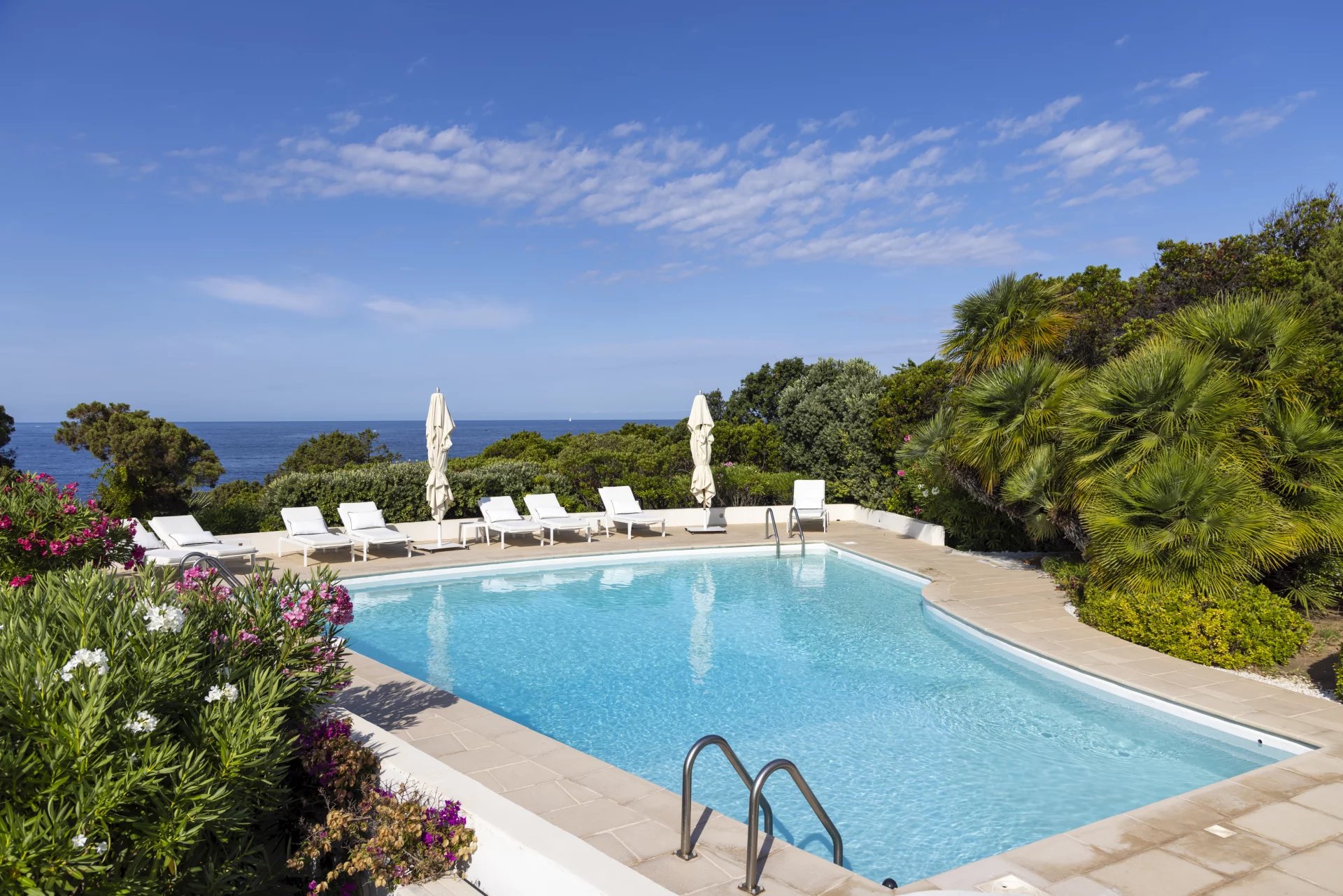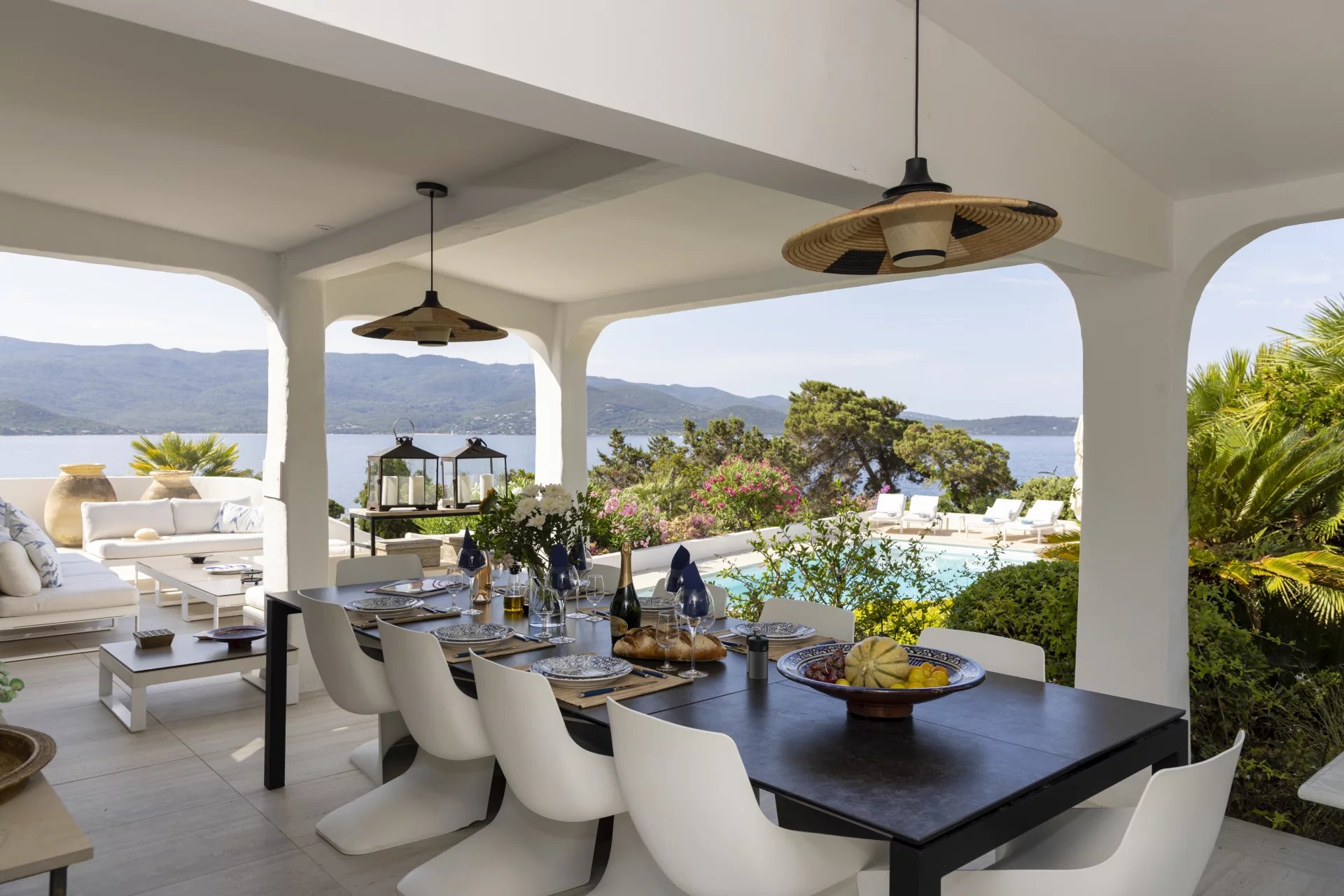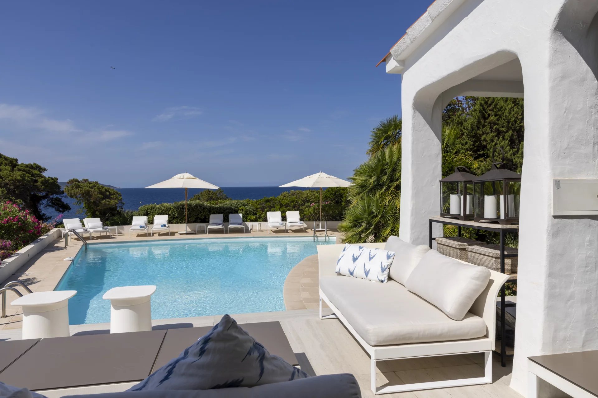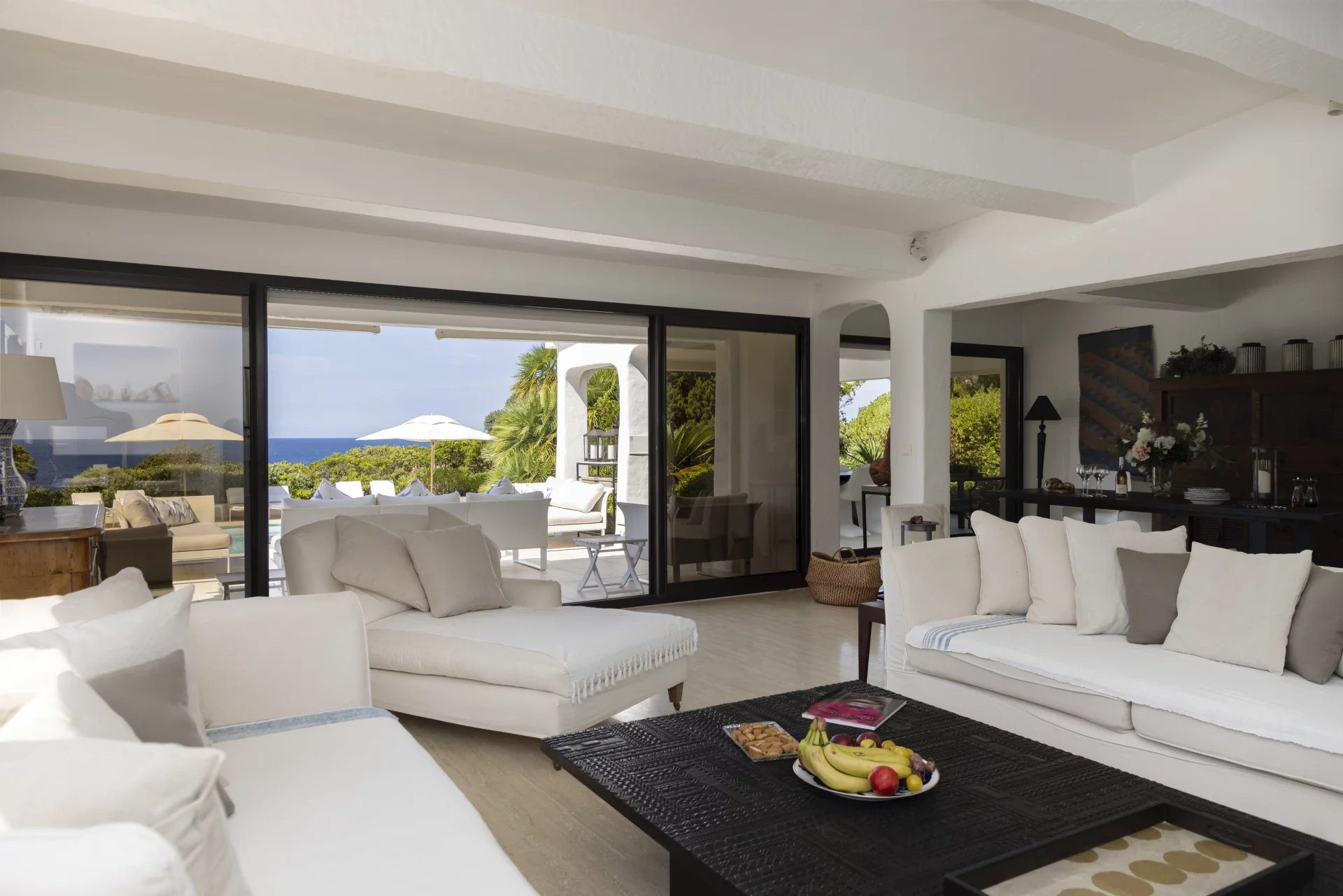 À l’extérieur, de vastes terrasses et espaces de détente surplombent la mer, la piscine et le jardin, offrant une vue imprenable et un cadre idéal pour des moments de sérénité.