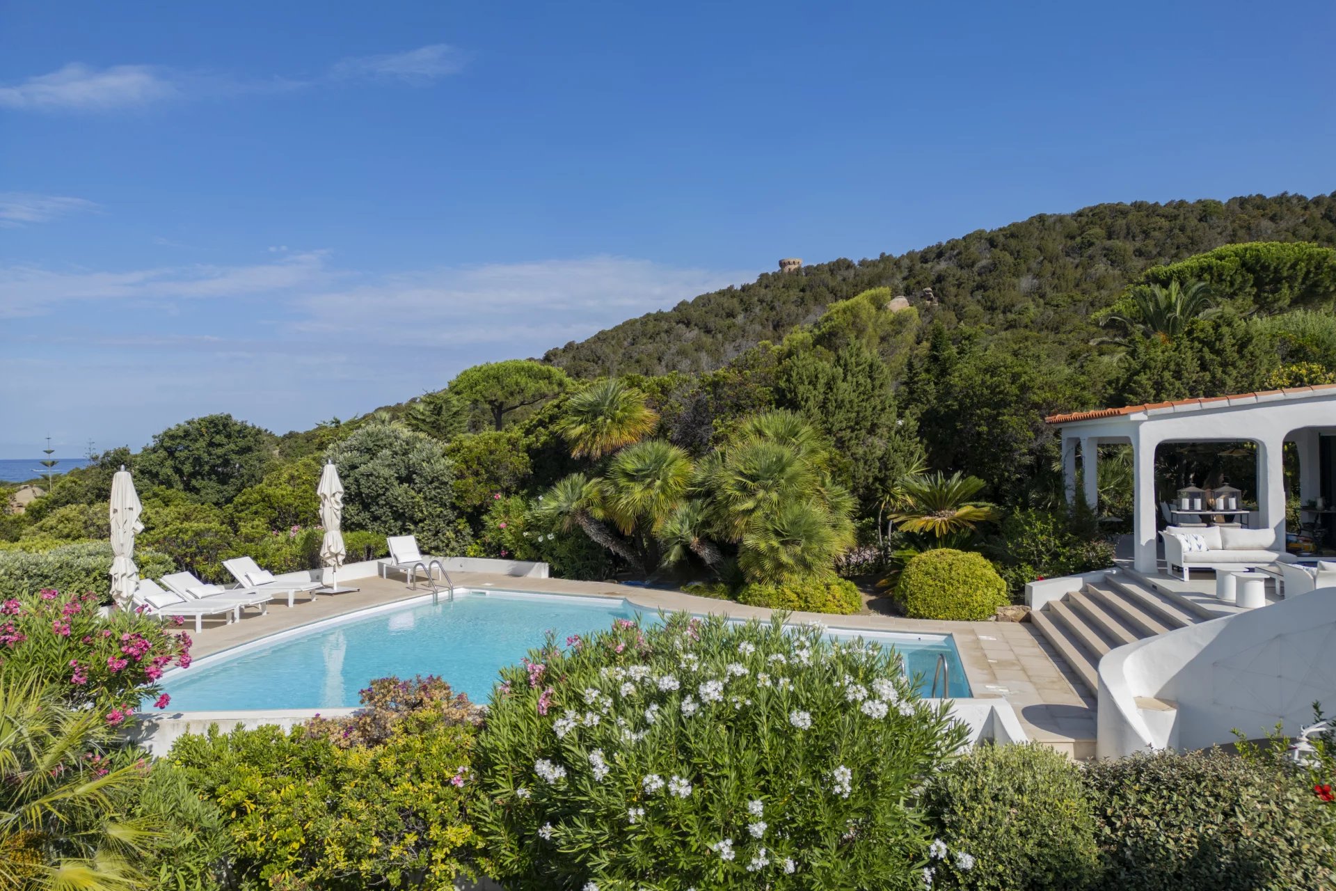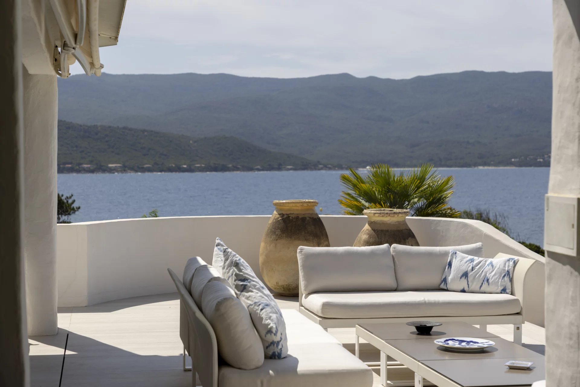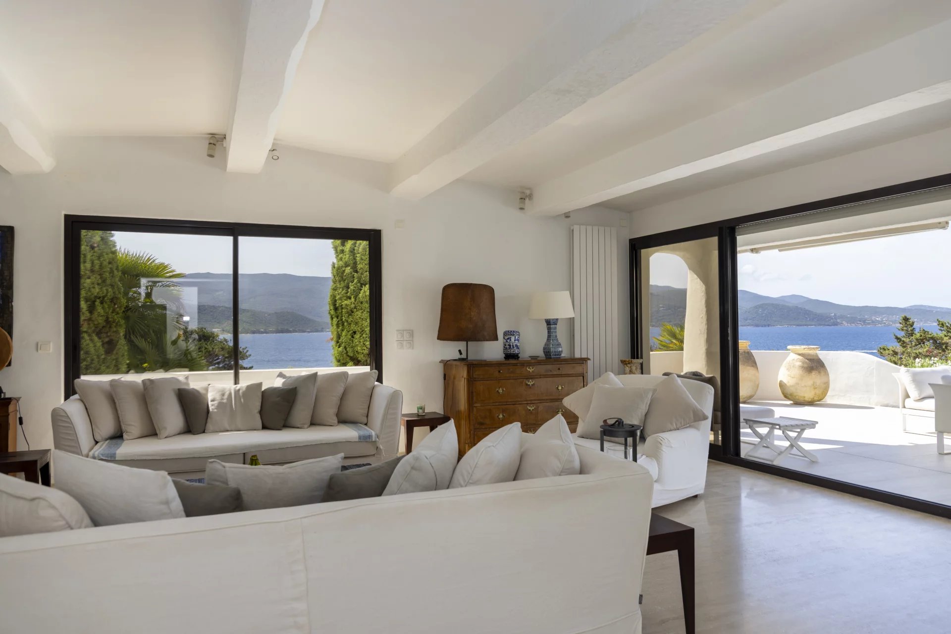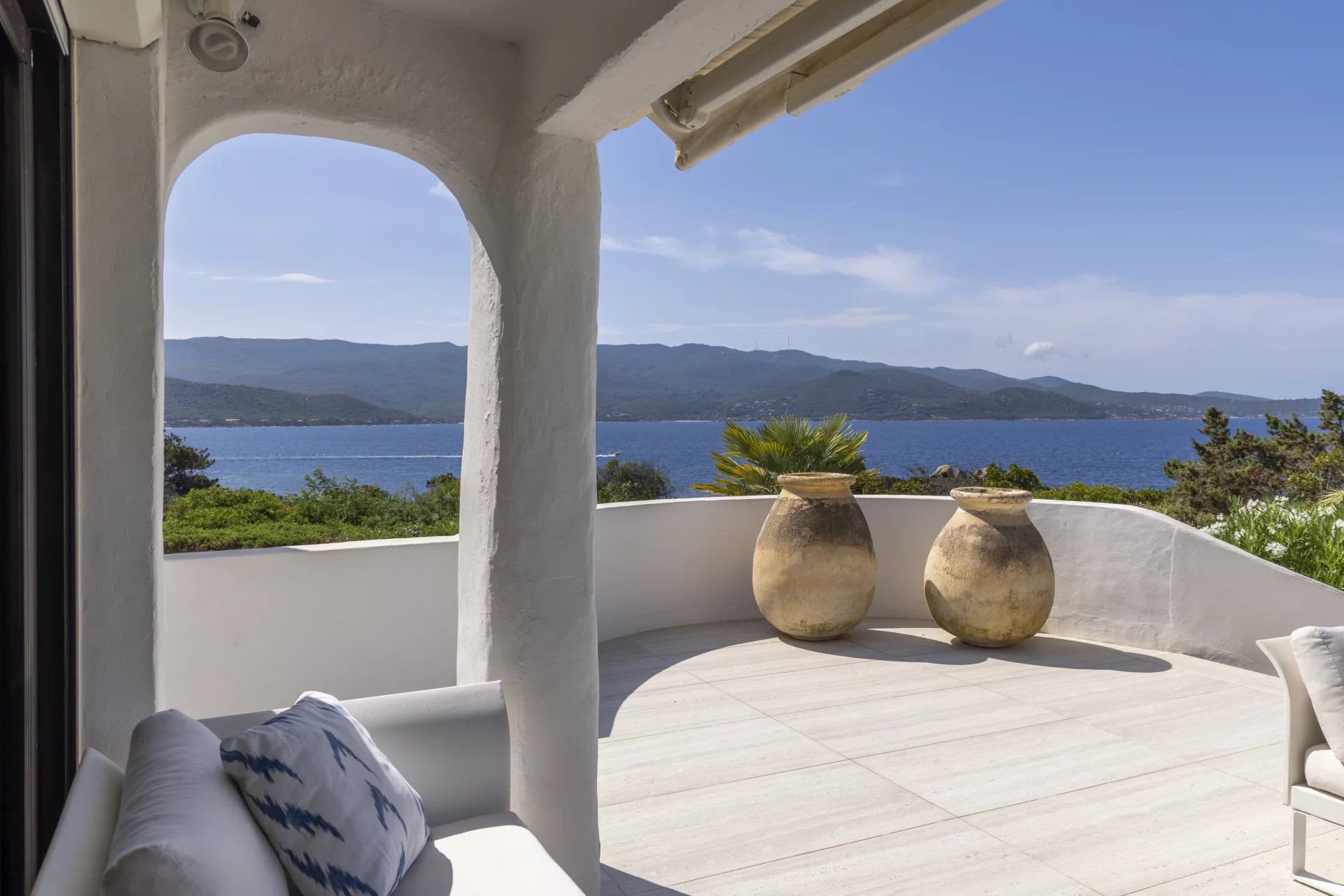 À l’extérieur, de vastes terrasses et espaces de détente surplombent la mer, la piscine et le jardin, offrant une vue imprenable et un cadre idéal pour des moments de sérénité.