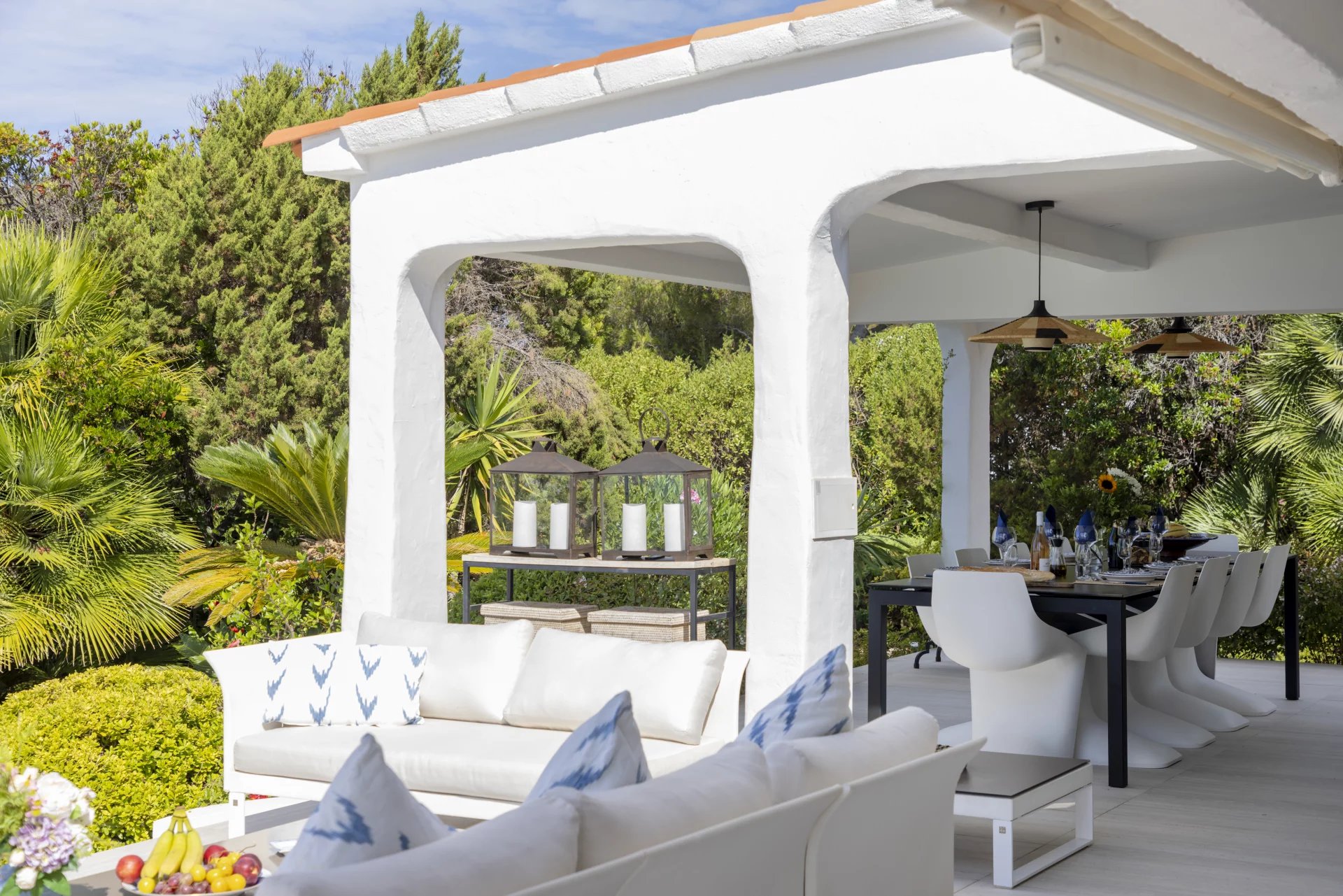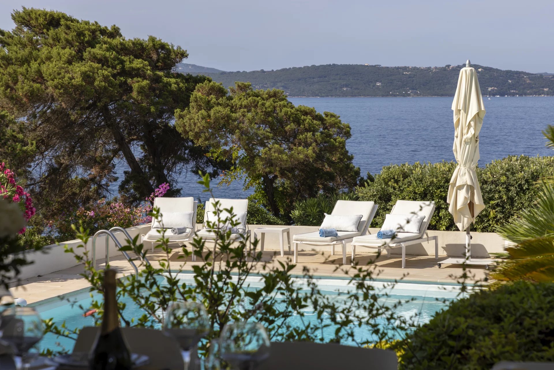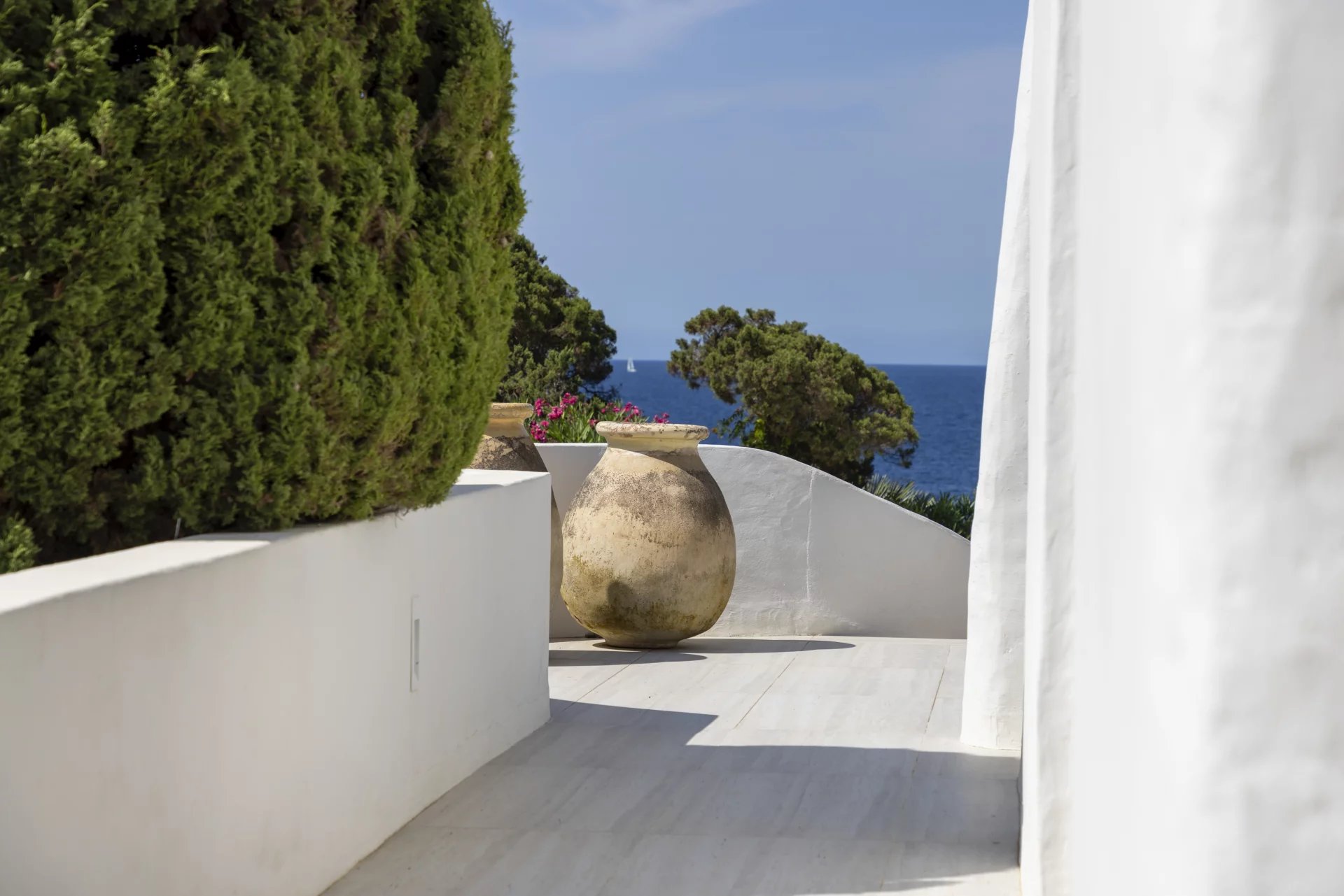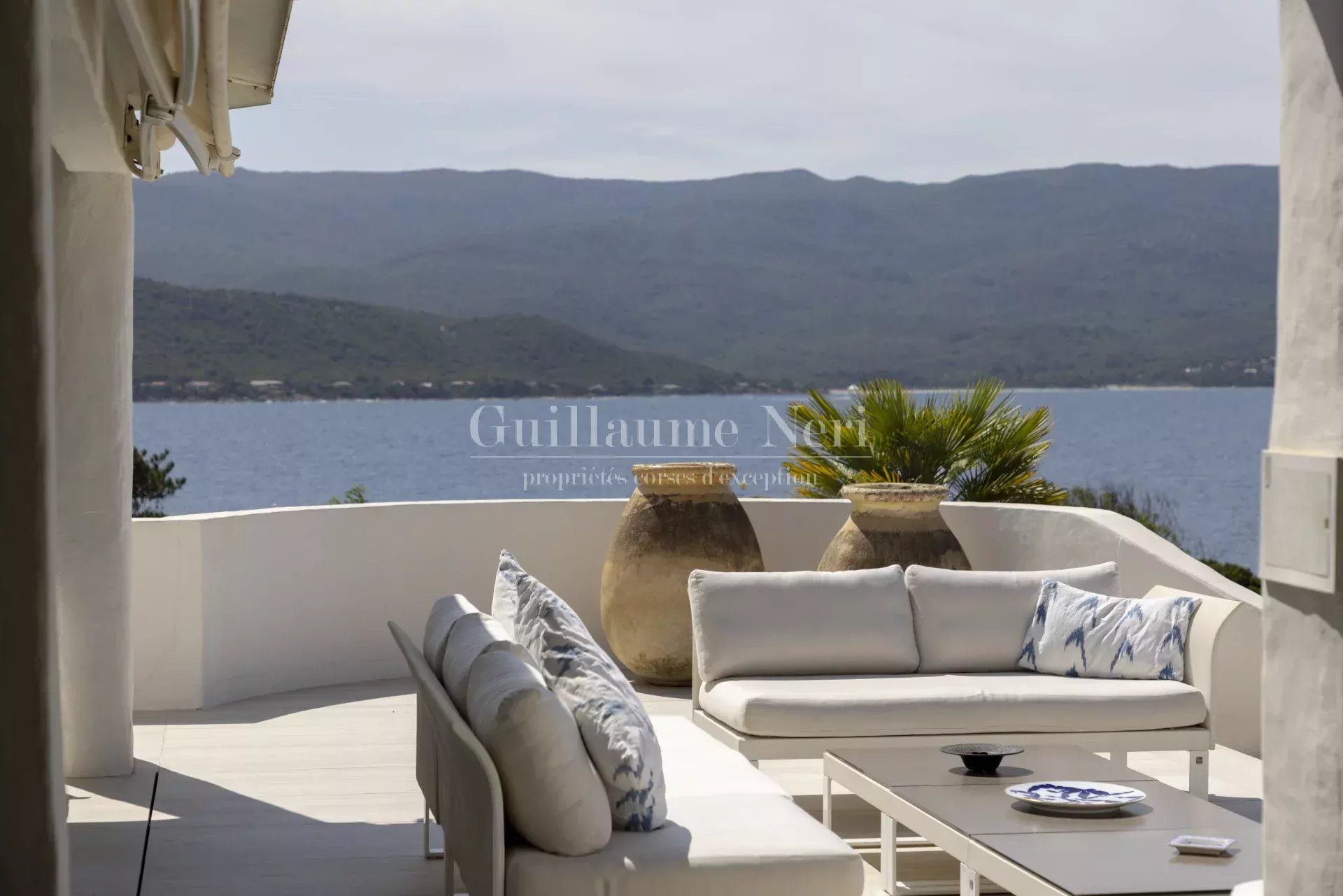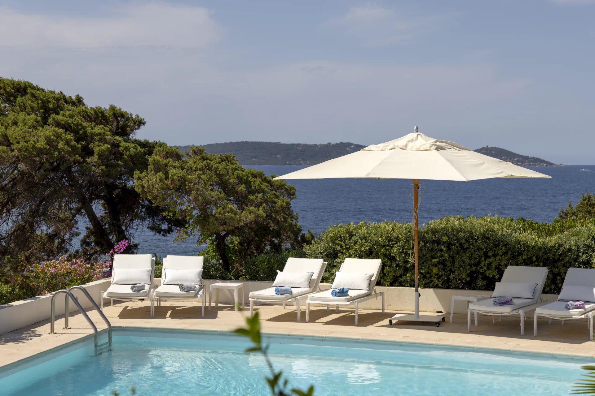 À l’extérieur, de vastes terrasses et espaces de détente surplombent la mer, la piscine et le jardin, offrant une vue imprenable et un cadre idéal pour des moments de sérénité.