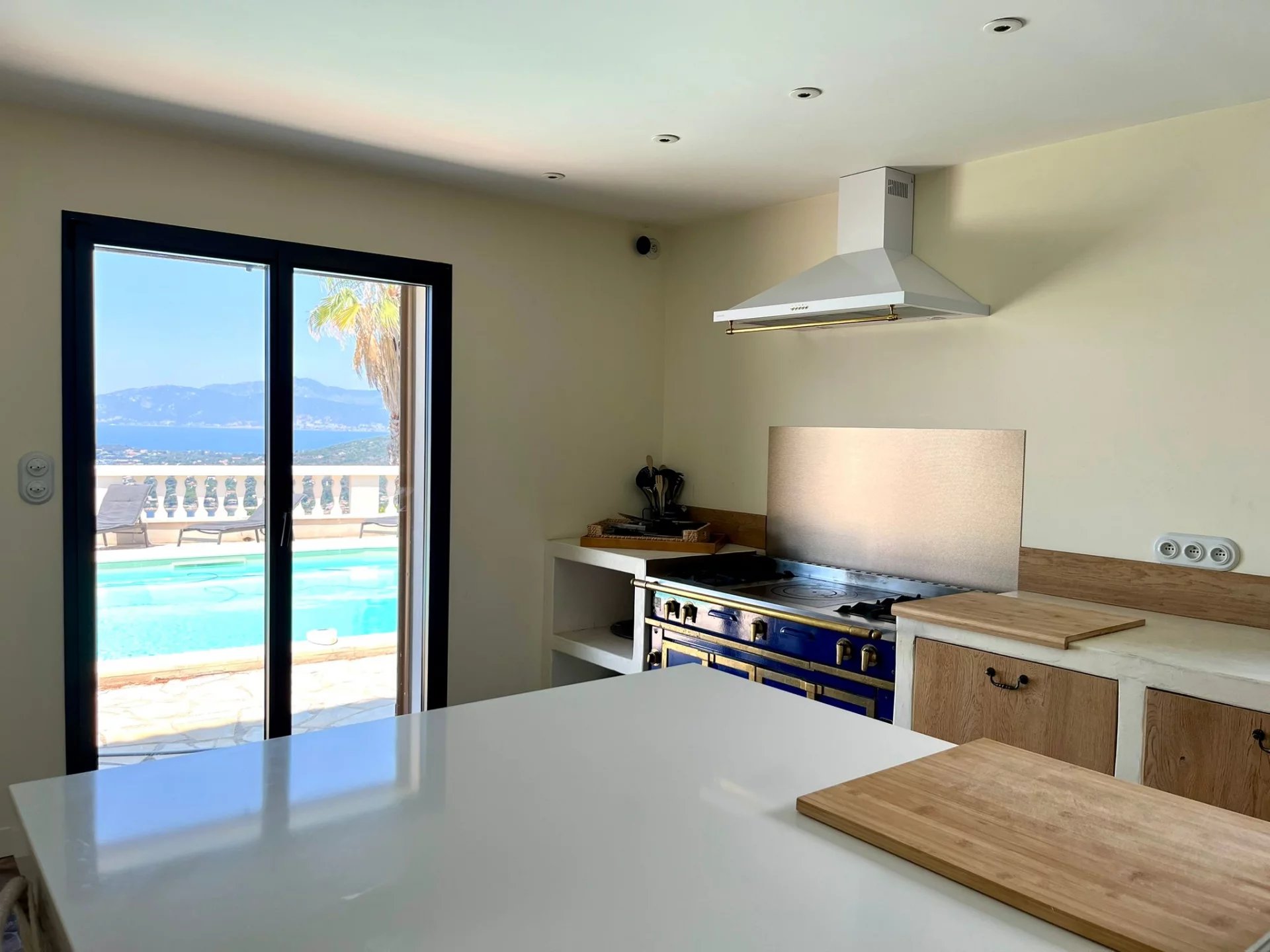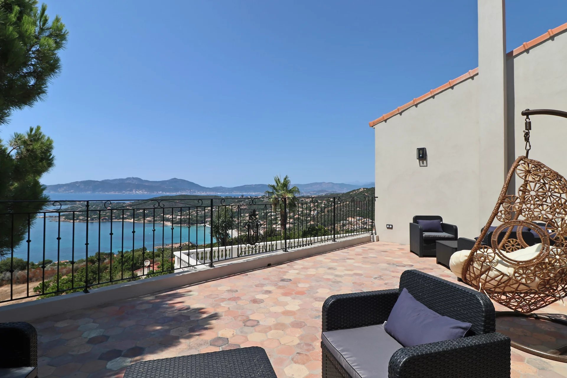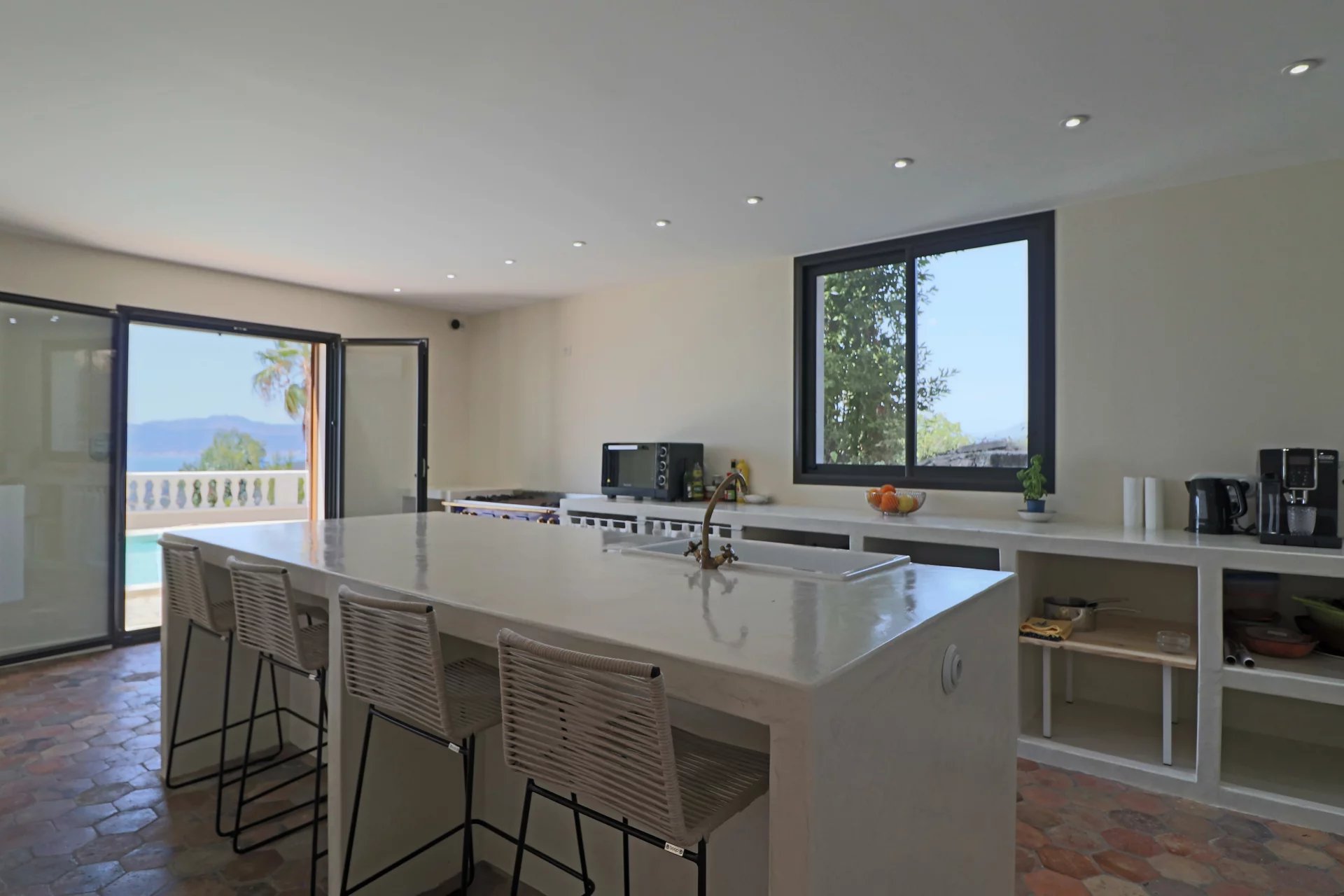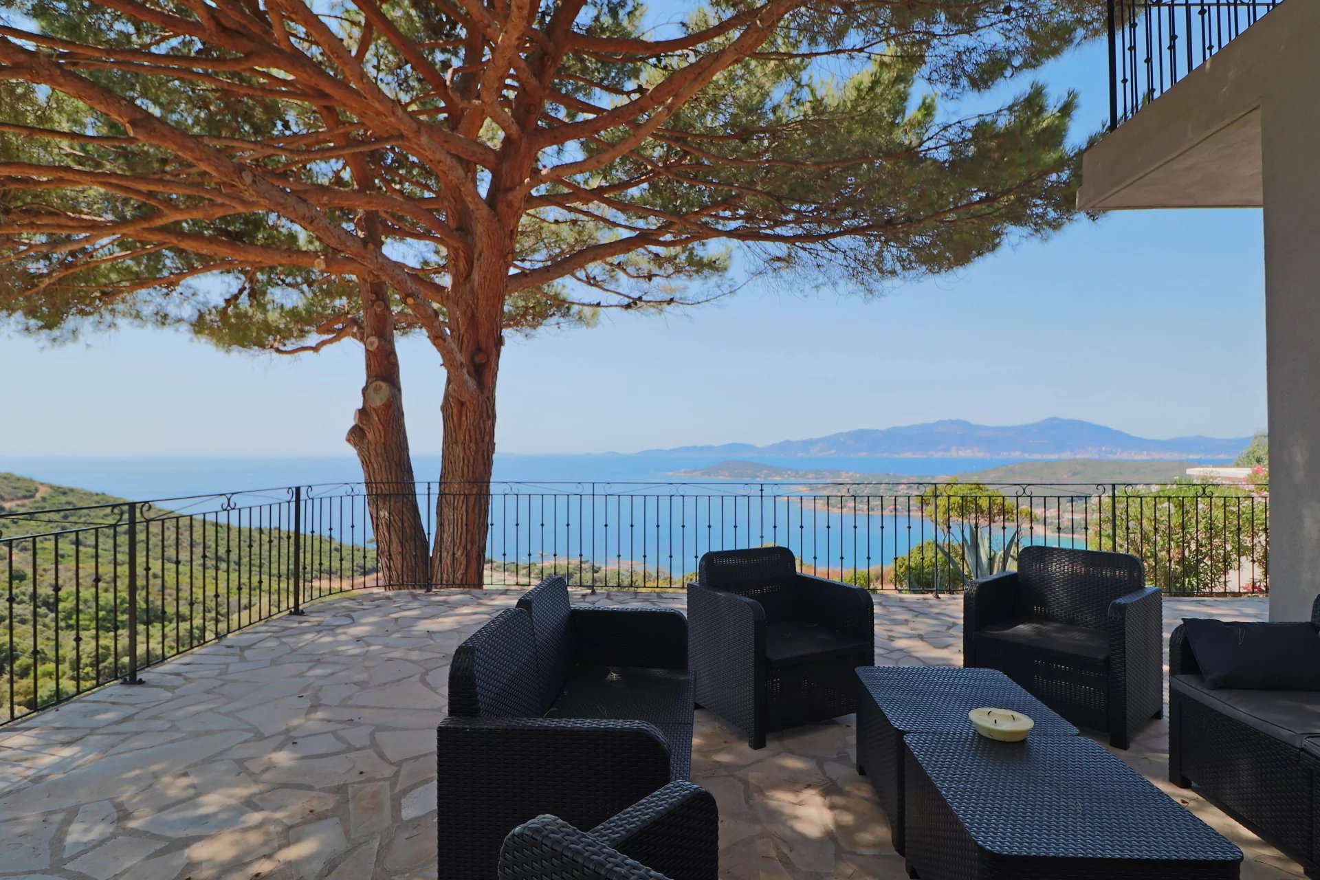 Terrasse aménagée avec piscine et vue panoramique sur la mer.