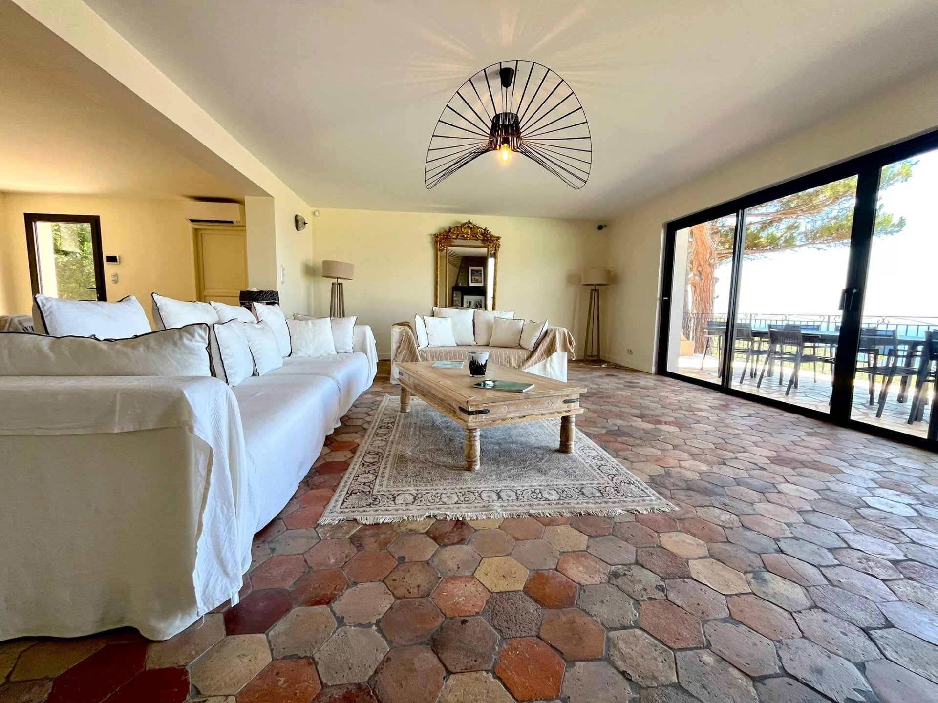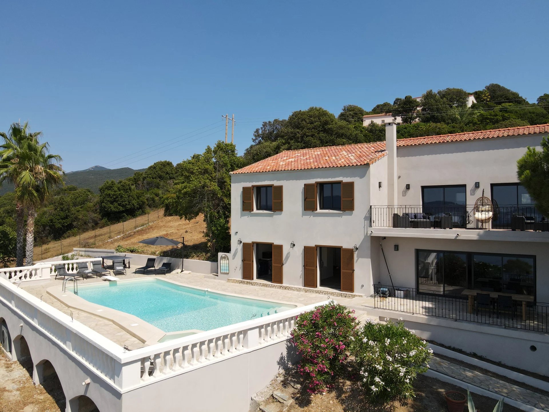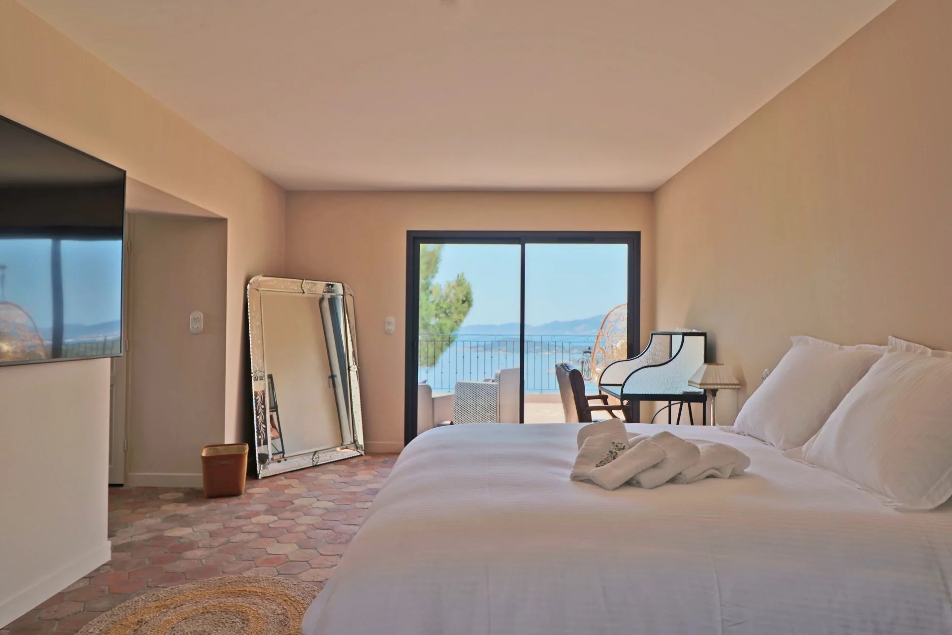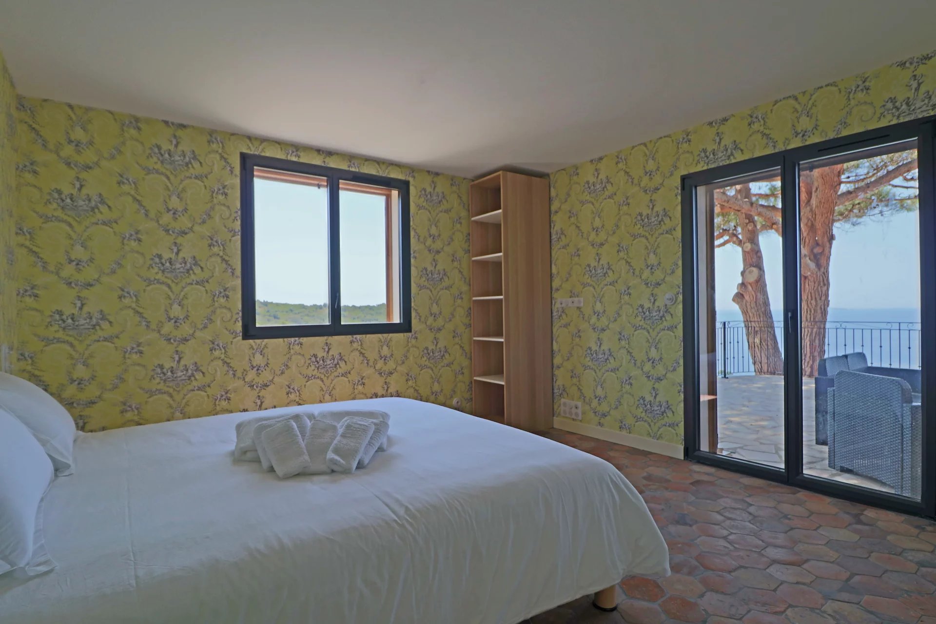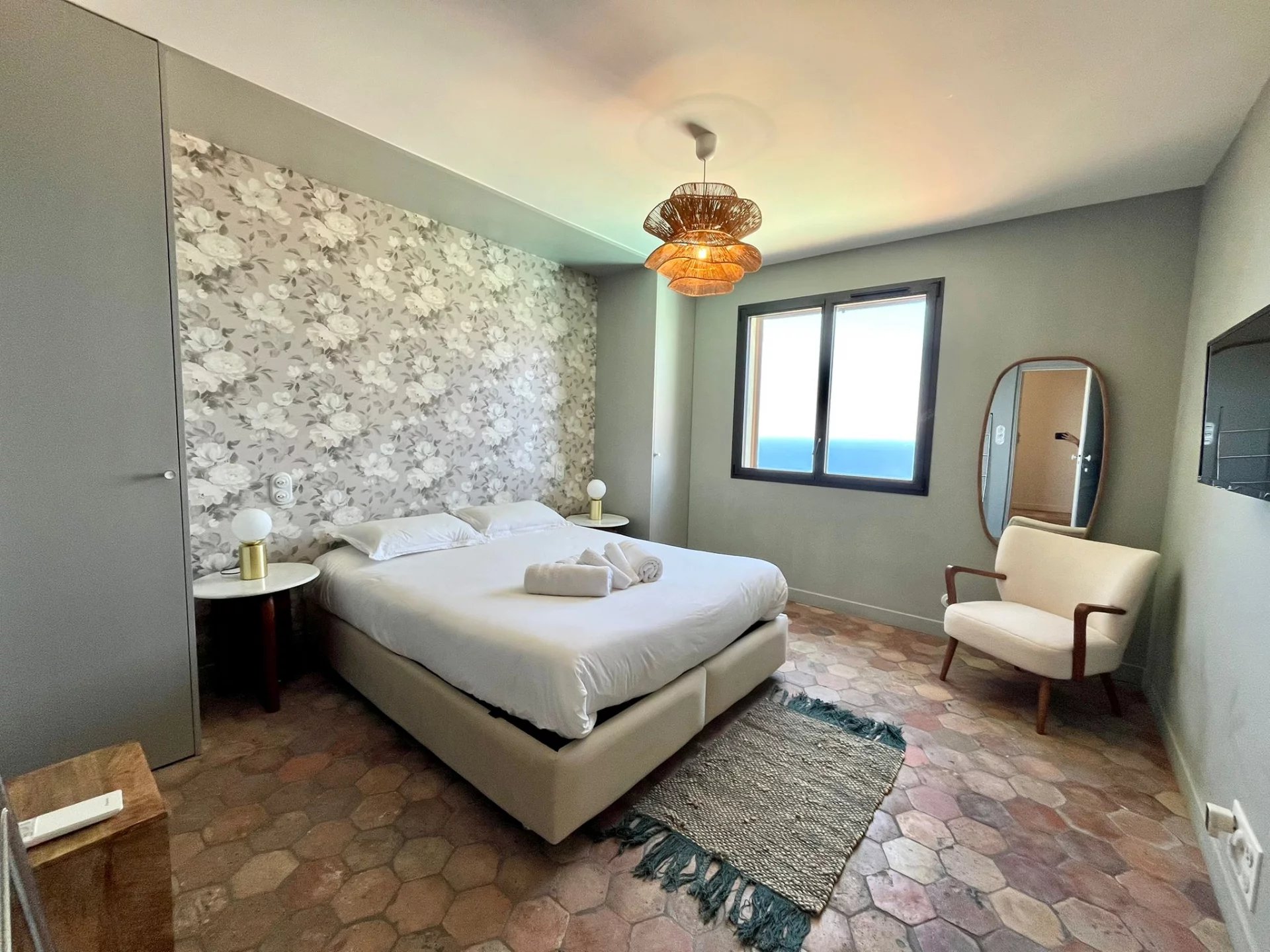 Terrasse aménagée avec piscine et vue panoramique sur la mer.