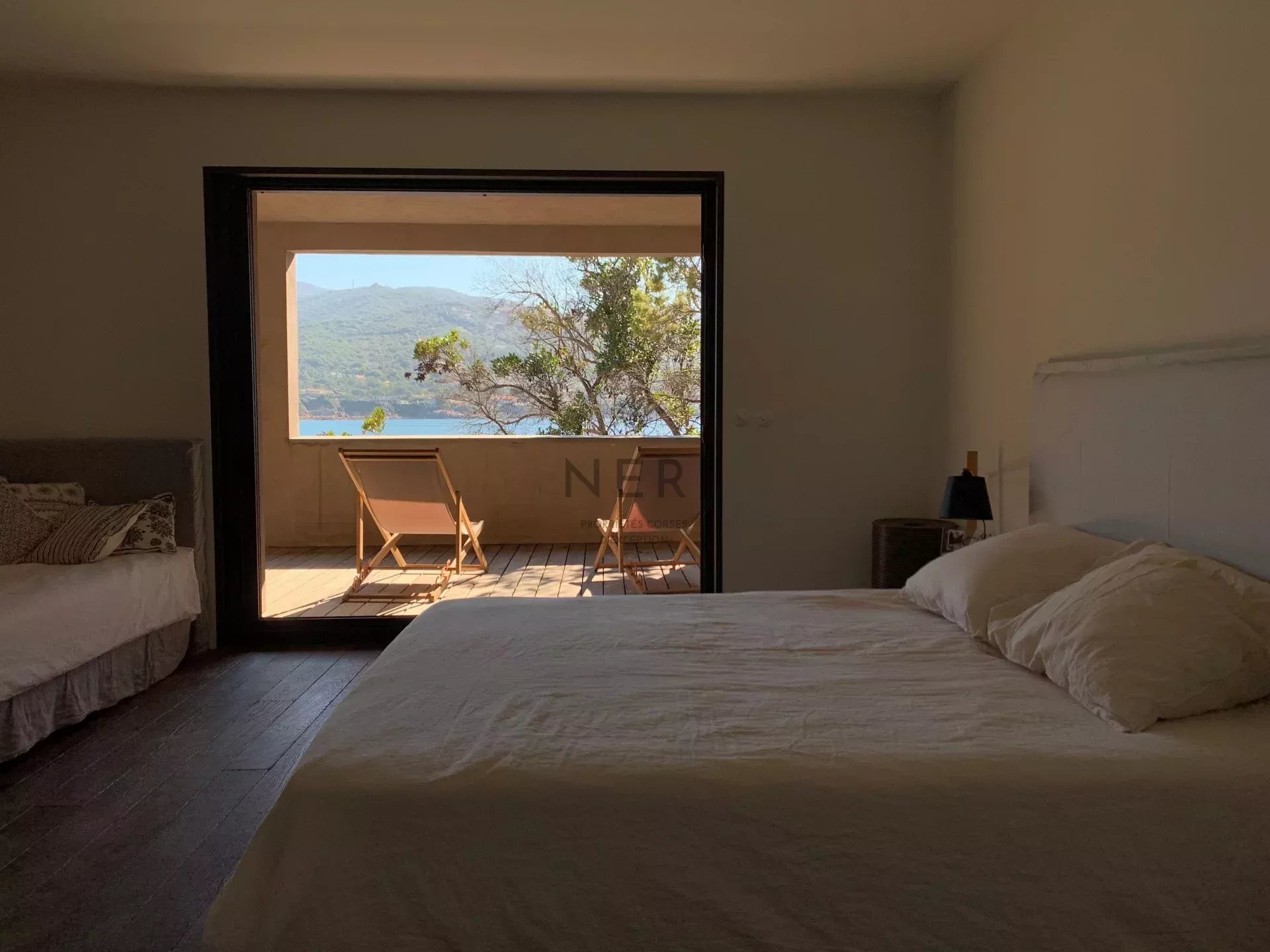 La pièce de vie, non climatisée, baignée de lumière, s'ouvre sur la terrasse et offre une vue imprenable sur la mer Méditerranée.
