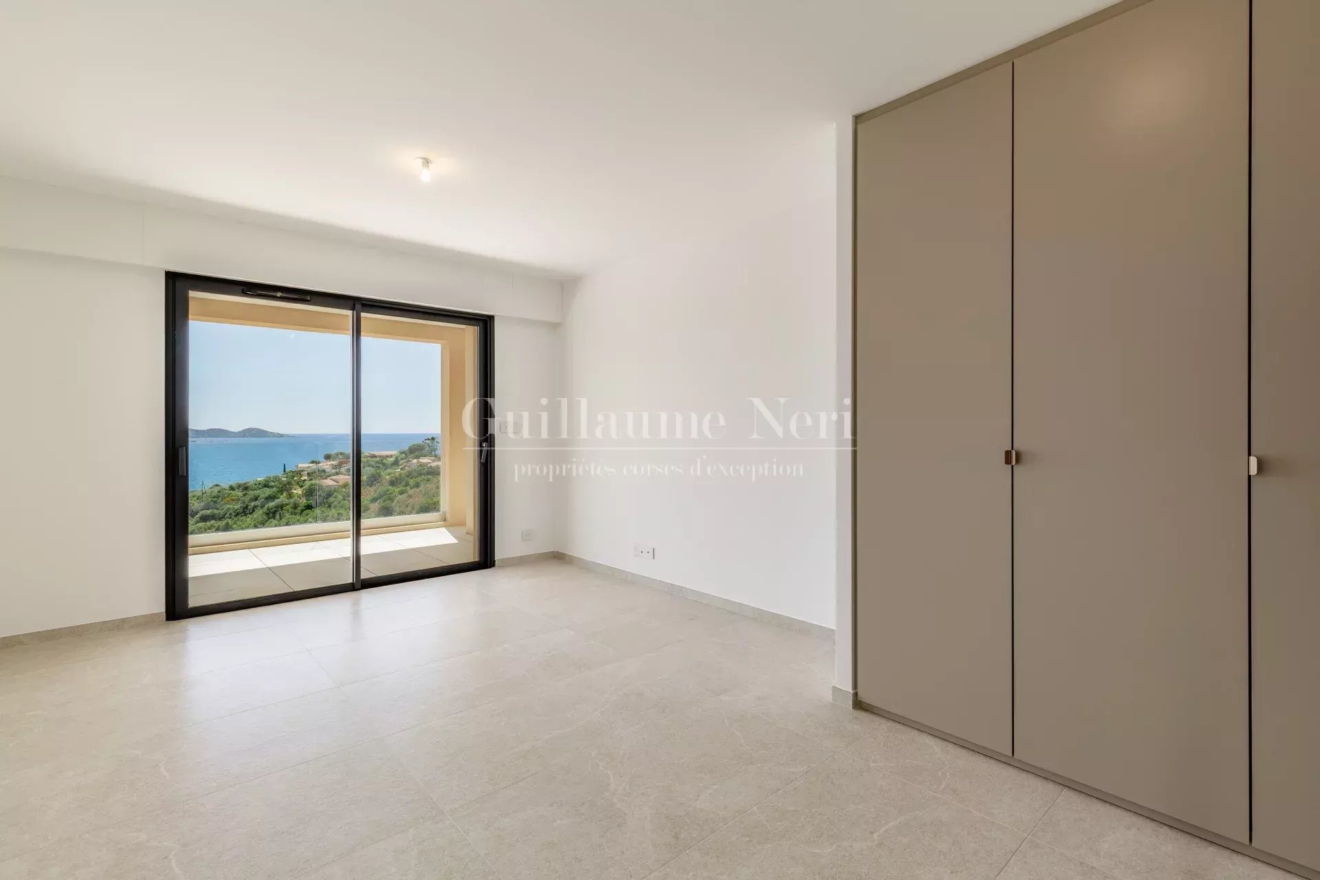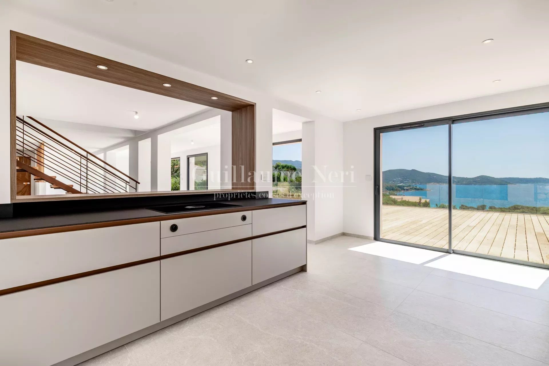 Les volumes intérieurs se prolongent naturellement vers l’extérieur : une vaste terrasse et une piscine avec vue panoramique sur le golfe viennent compléter ce cadre idyllique, propice à la détente.
